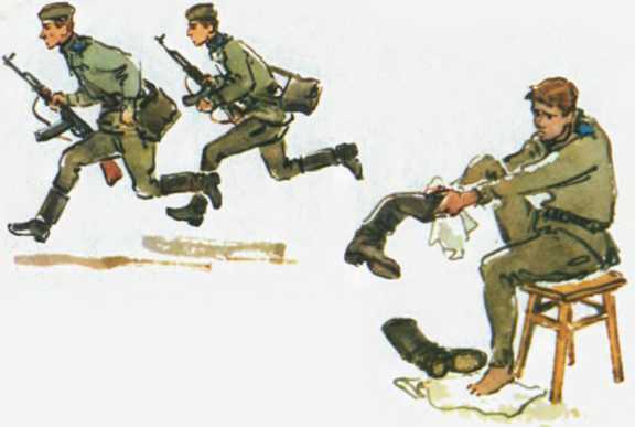 По тревоге поднимаемся — сапоги перепутает. Кросс бежим — ногу вывихнет.