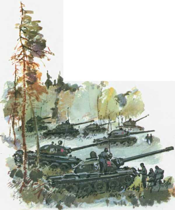 Впереди с грохотом рвутся мины. Свистя, летят осколки, срезают ветви деревьев, щёлкают по броне…