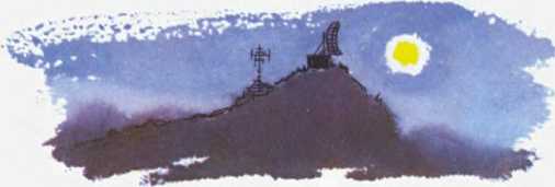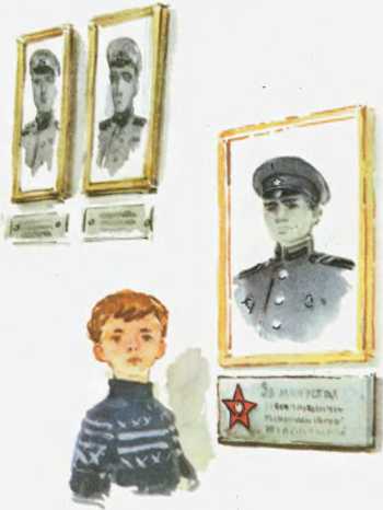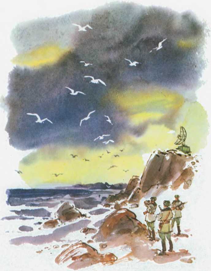 Невелик военный городок, в котором живут солдаты: казарма, клуб, столовая, радиолокационные станции — всё изобразил на своём рисунке художник. И служить здесь нелегко. Заметили — от казармы к радиолокационной станции тянутся канаты, словно верёвочные перила. Зимой солдаты держатся за них, отправляясь из казармы на дежурство. Иначе, когда начинается долгая полярная ночь, когда налетают снежные бураны, недолго сбиться с пути, заплутать. А то и ветер может свалить с ног.