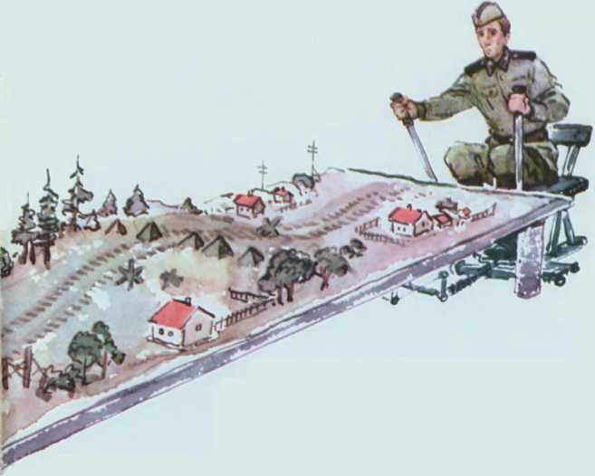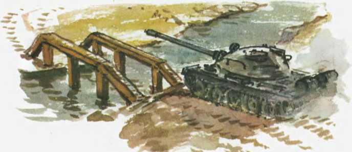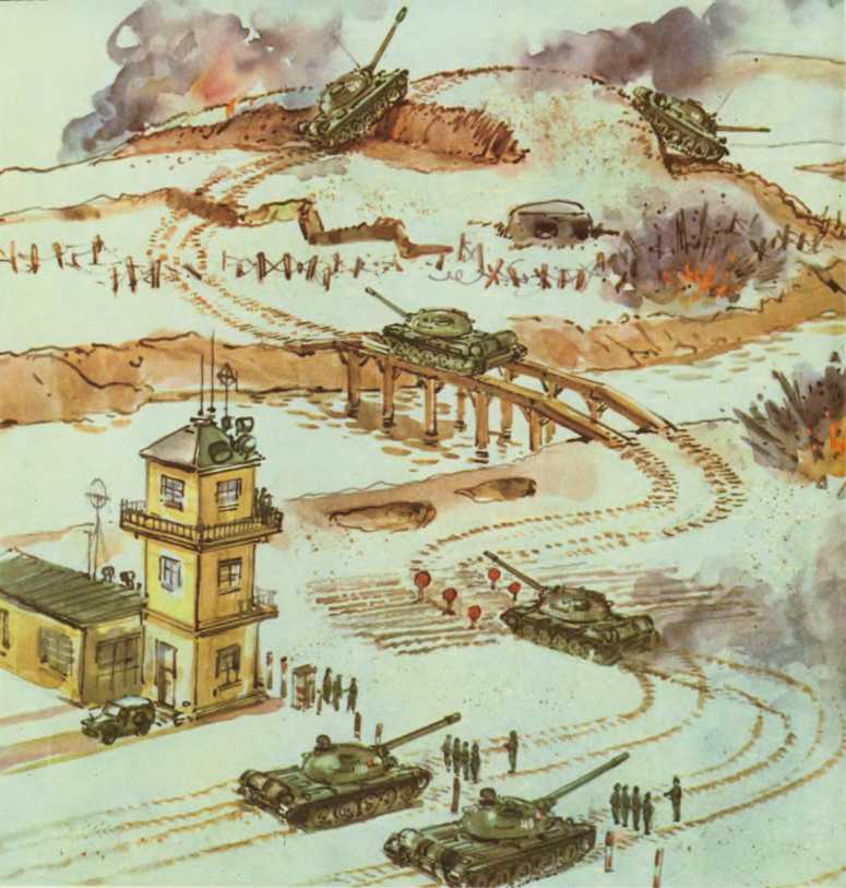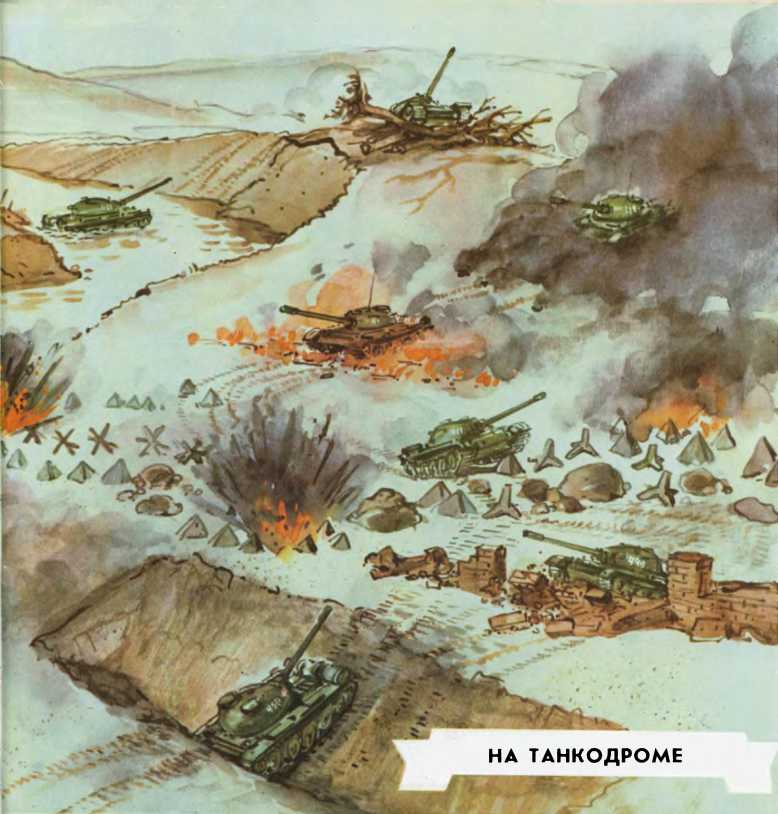 На этой картинке художник нарисовал танкодром. Вот два танка застыли на исходной позиции, возле вышки. Сейчас прозвучит команда — и они ринутся вперёд. Посмотрите, сколько разных препятствий им предстоит преодолеть! Сначала узкий проход в «минном» поле (видите, на рисунке он обозначен красными флажками), нельзя отклониться ни вправо, ни влево. Только остались позади «мины», а впереди уже мост, да не простой, особенный — всего два бревна, две колеи — будь, водитель, внимателен, не ошибись, иначе сорвётся танк вниз. А дальше — крутой подъём и отвесный спуск, и водная преграда, и лесной завал… А впереди уже поднимается дым и бушует пламя — и тут танкист должен не растеряться, смело направить машину в огонь. Что там ещё? Надолбы, развалины дома и наконец противотанковый ров. Тут уж, водитель, гляди в оба! Чуть не вовремя переключил скорость — и застрянет танк во рву. Вы заметили: танкист и пушку нарочно развернул в обратную сторону, чтобы не уткнуться ею в стенку рва.