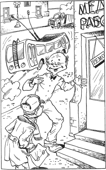 Я уже привык поздно вставать. Сквозь сон я слышал, как мама упрекала папу: — Топаешь своими ножищами! А он не должен слышать, что мы так рано поднимаемся: нельзя подавать ему дурных примеров! Папа снимал ботинки и ходил по комнате в носках и на цыпочках. Будильник в нашем доме по приказу мамы онемел и просто молча показывал время, как самые обыкновенные безголосые часы. Но в то утро мама сама разбудила меня. — Петр, — шепотом сказала мама, — ты окончательно не просыпайся: тебе еще спать да спать! Но я не могу уйти на работу, не предупредив тебя о том, что в цирке бывает несколько представлений в день… Если понравится, можешь остаться и на второе и на третье. Когда Дед-Мороз успел сообщить маме, что я собираюсь в цирк? И почему она не спрашивает, на какие деньги я туда пойду? И не волнуется, как я туда доберусь, хотя цирк находится совсем в другом конце города? Никто, конечно, не смог бы ответить мне на эти вопросы. Да и вообще, когда дело касается сказки, лишних вопросов лучше не задавать. Днем, выйдя на улицу, я не успел даже подумать, на чем бы мне добраться до цирка… Я не успел об этом подумать, потому что прямо к подъезду подкатил тот самый пустой троллейбус с дощечкой «В ремонт!» на заднем стекле. В нашем доме, на третьем этаже, жил один большой начальник, директор завода. За ним каждый день приезжала машина, которую в доме называли «персональной». Это слово почему-то произносили негромко, вполголоса. Тот легковой автомобиль марки «эмка», высокий и прямой, точно карета с мотором, сейчас не пустили бы на центральные улицы нашего города, как не пустили бы какую-нибудь старую телегу. Но в то время «эмка» казалась мне роскошным автомобилем. Иногда большой начальник катал ребят в своей персональной машине: взрослых людей в ней, кроме шофера, помещалось не больше четырех, а нас, ребят, набивалось по семь или даже по восемь человек. Ну, а в моем персональном троллейбусе могли бы уместиться десятки пассажиров, но ехал я в нем один-одинешенек.