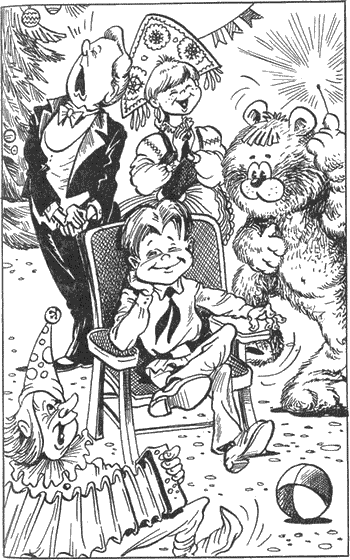 — Растрясло, наверное, — посочувствовал дядя Гоша. — Понятное дело: пустой вагон! Я стал прогуливаться возле входа, широко раздувая ноздри, втягивая в них холодный воздух и время от времени охлаждая лоб комочками снега: дядя Гоша с сочувствием смотрел, как я прихожу в себя. Но прогуливался я недолго. Вскоре из переполненного троллейбуса, остановившегося возле Дома культуры, выкатились три моих приятеля в масках. Выходившие вслед за ними пассажиры громко возмущались: — Без-зобразие! Ребенка напугали! В троллейбусе плакала девочка. — Какого ребенка! Я сама чуть не получила разрыва сердца — повернулась и вижу: медведь!.. Жора в маске медведя выглядел абсолютно взрослым: он был на полголовы выше массовика. Дядя Гоша стал отмечать что-то в своем блокноте: — Та-ак, хорошо! Один медведь пришел! Ослов у нас, помнится, вчера не было… И мартышек… Он пристальным взглядом окинул невысокого Валерика в маске осла и Мишку Парфенова, изображавшего проказницу-мартышку. — Это со мной: из детской самодеятельности! — пробасил Жора. — Не могли, что ли, за кулисами загримироваться? — Мы с другой Елки: опаздывали и не успели переодеться, — не своим голосом басил Жора. — Какие еще Елки в феврале?! Я в этот момент ахнул и схватился за виски… — Тебе плохо? — всполошился массовик: он берег единственного в мире каникуляра. Ребята скрылись в подъезде Дома культуры. И мне как-то сразу полегчало. Когда в вестибюле грянул оркестр, я шепнул своим друзьям: — Слышите? Для меня одного! И взглянул на Валерика. Но его ослиная маска ничего не выражала: ни восторга, ни удивления. Конечно, я давно уже мог попросить Деда-Мороза переменить программу елочного представления, показать мне что-нибудь новенькое. Но я боялся: а если в другой программе не будет знаменитых соревнований, которые я так привык выигрывать? И не будет призов, к которым я тоже очень привык! Когда с белокаменной лестницы ринулись мне навстречу лисы, зайцы и скоморохи, я снова шепнул: — Видите? Все для меня одного! К Жоре подбежал дядя Гоша: — Ты, медведь, из какой концертной организации? Почему стоишь со своим ослом из детской самодеятельности на одном месте? И с мартышкой тоже… Почему не работаете? — Мне очень приято, что они стоят рядом, — сказал я. — Это меня очень развлекает! Дядя Гоша виновато отступил: — Твое слово для нас — закон!.. — Видишь, как он меня слушается? — шепнул я Валерику. — Что захочу, то и будет делать! Но ослиная физиономия даже не дрогнула. «А что там, за масками? — думал я. — Наверно, в себя не могут прийти от восторга и удивления!» Но, поднявшись в фойе Дома культуры, осел, медведь и мартышка пришли в себя очень быстро. Прежде всего, вместо того чтобы развлекать меня, они сами взобрались на деревянных карусельных коней и стали кружиться. Потом они скатились вниз с деревянной горки… Но внизу их уже поджидали разные «звери» из концертных организаций: — Мы работаем, а вы катаетесь! Развлекаться сюда пришли, что ли? Конечно, мои друзья пришли развлекаться. Ненаходчивый Жора ответил: — Это он нас попросил. «Мне, говорит, самому надоело кружиться и кататься: хочу посмотреть, как у вас получится!» — Да, — подтвердил я, — это так интересно: смотреть, как другие катаются! — Ну, если тебе интересно, тогда другое дело: все для твоего удовольствия! И я после этого сразу попросил моих друзей пойти пострелять 
