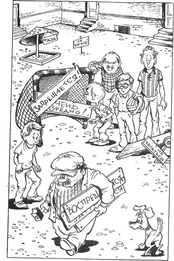 У нас был большой двор. Конечно, он остался таким и сейчас, но я теперь старше — и то, что в детстве казалось мне огромным, стало большим, а то, что казалось большим, стало просто немалым. В доме у нас, сколько я себя помню, всегда была «комиссия по работе среди детей». Председателем ее был сам управдом. Комиссия заботилась о нас: устраивала разные экскурсии и даже путешествия на пароходе. А еще она любила заседать и издавать распоряжения, которые тут же расклеивались на столбах: «Категорически запрещается звонить в чужие квартиры и убегать, не дождавшись, пока откроют!», «Запрещается становиться ногами на скамейки, где люди должны сидеть!», «Запрещается переговариваться друг с другом через двор в форме крика: это мешает жильцам отдыхать!» Валерик не входил в «комиссию по работе», по он придумал устроить во дворе крокетную площадку и футбольное поле, которое зимой становилось хоккейным. Валерки уже давно здесь нет… А то футбольное поле есть и сейчас. И крокетная площадка тоже. И в красном уголке по-прежнему показывает спектакли наш теневой театр, который открыл свой первый сезон еще тогда, много лет назад, пьесой Валерика «Ах вы, тени, мои тени!».