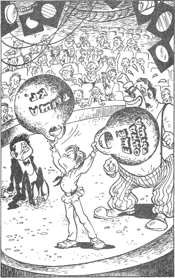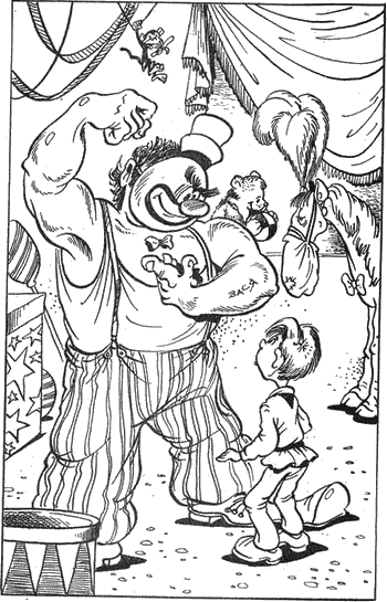 «Вниз, направо, вторая дверь!» — повторил я про себя. Вниз?.. Может быть, Дед-Мороз хочет, чтобы я проник в здание цирка подземным ходом? Но на той самой второй двери справа не было напитано «Подземный ход», а было написано «Служебный вход». Я вошел… И ко мне сразу кинулось трое или четверо людей в форменных костюмах с серебряными полосками. — Никто не видел, как ты сюда зашел? Никто не слышал, как тебя сюда послали? — Никто, — ответил я. — А что такого особенного, если б кто-нибудь и услышал? — Это невозможно! — раздался громовой голос. — Тогда бы все погибло. — Что погибло? — тихо спросил я, отступая назад перед огромным человеком в ярком и нелепом клоунском костюме. — Что бы тогда погибло? — Тогда бы весь мой номер сегодня в зале помер! Эти стихи почему-то очень напомнили мне стихи дяди Гоши. — Нет, никто ничего не видел, — тихо сообщил я. — Тогда все будет гладко: ведь ты — моя «подсадка»! Дядя Гоша декламировал только во время представлений, а этот знаменитый клоун-богатырь (конечно же, это был он!) все время разговаривал в рифму. «Наверно, не все люди, которые пишут и даже говорят стихами, называются поэтами», — неожиданно подумал я. У клоуна-богатыря было свирепое лицо: насупленные брови, огненно-красные щеки, которые напоминали две раскрашенные тыквы, глаза состояли из одних только круглых черных зрачков, а белков совсем не было. Но это была маска. А под ней, мне казалось, должно было скрываться лицо, очень похожее на лицо массовика дяди Гоши — вечно ликующее, неизвестно чему улыбающееся. И лысина, наверно, была такая же блестящая, словно отполированная, хотя над маской торчала мохнатая и густая щетка чьих-то чужих волос.