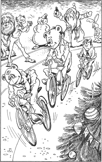 Но друзьям не сиделось. И когда Дед-Мороз объявил знаменитые соревнования — «Кто всех быстрее? Кто всех ловчее? Кто всех умнее?», — все трое подняли руки, словно они были в классе и хотели ответить на вопрос учительницы. Этого, конечно, я предвидеть не мог. — Странные какие-то звери, — негромко сказал Дед Мороз своему помощнику дяде Гоше. — В одних масках, без шкур… — Это не профессиональные звери, — пояснил массовик. — Они из самодеятельности. — Ах, так? Тогда объясните им, что в соревнованиях могут участвовать только каникуляры и каникулярки: мы здесь работаем, а не развлекаемся. — Помоги нам, — умоляюще прошептала мне в ухо проказница-мартышка. Казалось, она вот-вот расплачется Мишкиными слезами. — Заступи-ись… Ведь ты здесь всесильный! Я вскочил со своего места: — Меня бы очень развлекло, если бы они приняли участие в соревнованиях. Я получил бы от этого огромное удовольствие! Просто наслаждение!.. — Просьба каникуляра для нас — закон! Как жалко, что я в тот момент не мог одернуть с Валерика его ослиную маску: мое слово было законом для Деда-Мороза! Для самого повелителя всех елочных праздников, при одном появлении которого дети начинают прыгать и вопить не своим голосом. Неужели и это не поразило моего лучшего друга? Неужели?! Дед-Мороз застыл с секундомером в руке возле елки, а я, как всегда, оседлал «старого, но боевого коня», пришпорил его и поехал по кругу. Я именно не помчался, как в тот первый день, а всего-навсего поехал, потому что за полмесяца я привык уже, сидя на кожаном велосипедном седле, еле-еле шевелить ногами. «Быстрей, быстрей!» — подгонял я самого себя: мне вдруг очень захотелось выиграть у своих друзей самому, без помощи волшебной силы! Но «старый конь» не слушался меня и «плелся рысью как-нибудь»… Велосипед был один, и поэтому соревнующиеся садились на него по очереди. Вторым сел Жора. Он, конечно, был лучшим спортсменом из нас четверых, но велосипед был ему мал: Жорины ноги смешно сгибались в коленях, а колеса крутились не быстрей, чем у меня. С такими ногами Жоре было бы лучше всего соскочить на пол и просто побежать — он добрался бы до финиша гораздо скорее. Но по условиям соревнования нужно было не бежать, а ехать на велосипеде. Валерик в маске осла тоже не продемонстрировал рекордной скорости. И первое место, таким образом, заняла проказница-мартышка. — Тебе доставит удовольствие, если я вручу мартышке победный приз? — спросил Дед-Мороз. — Я буду просто счастлив! Это так развлечет меня, так развлечет!.. — сказал я, хоть на самом деле мне было в тот миг не до веселья. — Но ведь там пастила и шоколадная медаль… — И пряники! — радостно подхватил я. — Пусть мартышка получит все это. Я нарочно проиграл соревнование, чтобы она могла полакомиться в свое удовольствие. Или, вернее сказать, в мое удовольствие! — Как это — нарочно проиграл? — запротестовала мартышка голосом Мишки-будильника. — Тогда давай переиграем! — Сразу видно, что это не профессиональная мартышка, — шепотом утешил меня дядя Гоша. — Настоящие мартышки никогда не спорят со зрителем. Тем более с каникуляром! «Какая неблагодарность! — думал я. — Только что умолял помочь допустить до соревнований… А теперь осмелел: „Давай переиграем!“» Переигрывать мы, конечно, не стали, и Мишке был вручен бумажный пакет. А потом дядя Гоша установил свои металлические обруч