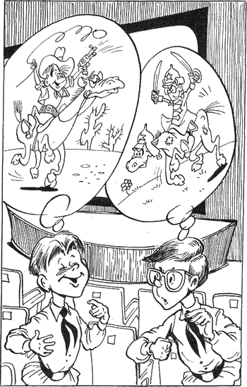 ИГРОВЫЕ АВТОМАТЫАккуратно обмазанная клеем, преображенная хижина вернулась на свое место, так что комар носа не подточит. Очнувшиеся разбойники вскочили и уже собирались дать стрекача, но толстяк недаром был атаманом. Увидев вывеску, он первый бросился к игротеке, едва успев обронить на бегу: — А про пиратов игра есть? — Надо, чтоб было много золота и пистолетов! — добавил кто-то, едва поспевая за своим на диво быстроногим шефом. — Вперед, канальи! Золото, стрельба, пираты — выбор на самый широкий разбойничий вкус! — вдохновенно балаганил Тот, кто отказался от себя. Всякий знает, как любят разбойники играть, и не только в казаков-разбойников или в карты — у них вся жизнь игра, как сами они любят повторять. Каждый спешил занять место в игротеке. Кто не успевал, набивались в окна и двери. Парень, тощий, как болотный пень, неуклюже висел на створке окна. Хватило ума, догадался, что ему страшно мешают огромные сапоги Кота. Он сбросил их и стал устраиваться в окне поудобней. Располагаясь на чьей-то спине, он умудрился одному увальню прищемить ухо. Подсобрав свои сапоги, Кот не заместил привести себя в надлежащий вид, после чего пощекотал своего обидчика кончиком шпаги. Тот завертелся, захихикал и окончательно лег на своего бедолагу-сподвижника. Ледышка выплюнул льдинку и сказал: — Надо разбудить Железного и Бумажного. От волнения они, кажется, заснули. Как бы они не застряли на этой картинке. — Да, сказал Тот, кто отказался от себя, — нам пора отправляться дальше. Эти, — он кивнул на бывшую разбойничью хижину, — больше нам не помеха. И не только нам. Пока они заняты игрой, все путники на этой дороге в полной безопасности. Пожелаем игрокам долгого азарта. Долгий азарт — здоровый азарт! — подвел черту помудревший избавитель.