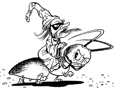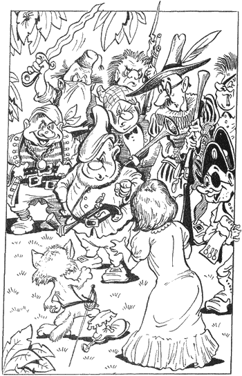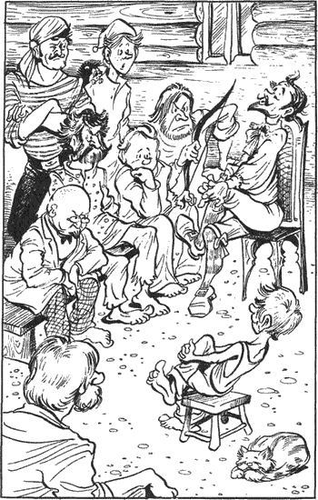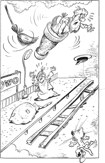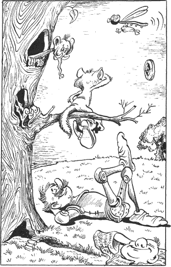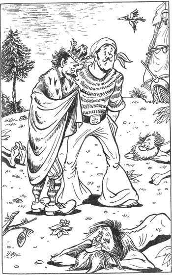 Убедившись, что путники были именно в этом роде, они отбросили всякие опасения. Шпага у Кота на боку — единственное, обо что можно было уколоться. Но по своей древности она показалась им попросту смехотворной. — Наше вам с косточкой! — гаркнул на путешественников атаман, толстенный коротышка с пистолетом в виде самоварной — грубы. — Канальи! — пробаюкал он, обращаясь к своим, — как вам нравится этот столбняк тридцать первой степени? Разбойники загоготали, подбрасывая шапки. — Почему же непременно тридцать первой? — дипломатично начал Кот. — Читать умеешь? — выпятил грудь атаман. — Что написано? — Бяка. — Прочитал Кот. — Правильно, — лихо подмигнул атаман. — Это ты. А с этой стороны, что написано? — он повернулся к Коту спиной. Кот прочел на майке: — Бойдодыр. — Верно, это я. — Ликовал толстяк. — Каждой бяке свой Бойдодыр, понятно. Бой, так сказать, до дыр. — Дыр-дыр, — невпопад брякнул Кот. — А это, простите, на каком языке? — На бойдодырском! — парировал атаман. Гогот усилился. Коту прищемили шпагу. — Сдается мне, что эта девчонка — принцесса, — подкатился толстяк к Падине. — Ишь, как смотрит! Королевна! Придется твоего королевского папу потрясти как следует, чтобы в моем мешке чуточку прибавилось золотых монет. Самую что ни на есть чуточку! Оглядев остальных, он безнадежно крякнул: — Жидковаты! Из таких ничего не выжмешь, кроме слез для жалостливых. А вот котик пригодится, мы его отправим мышей ловить в нашей хижине. Кот сердито застучал хвостом по сапогам. В тот же миг Кота подняли на воздух. Парень, тощий, как болотный пень, словно из-под земли выскочив, ухватился за его сапоги. Пока все бестолково разевали рты и награждали друг друга тумаками, сморчок в сторонке уже постукивал обновой. — Фирма! — причмокивал он. Кота связали.
