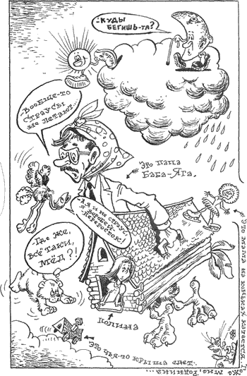 Снова горит костер. Правда, теперь он горит у разбойничьей хижины. Хижина не хижина, а так — небольшой клуб с колоннами на высоком крыльце. В открытые окна слышно было, как бушевал атаман: — Ребята! Выкуп нам обеспечен, так что гуляйте, кто во что горазд, я сегодня щедрый. — Га! — отвечали кувыркающиеся через голову голоса. Треснула колода карт, хлопнула пробка. Разбойники изо всех сил старались развеселиться. Пленники теснились вокруг костра. — И чего это он расхвастался, как будто ему наобещали золотые горы! — Полина пожала плечами. При этом она старалась припомнить, как она действовала, когда папа был Бабой-Ягой, а она Иваном Царевичем. Никто не охранял сидящих у костра. Кого было охранять, если один из них отсутствовал сам по себе, двое других были опутаны собственными цепями, а Полина — не из тех, кто спасается за счет других. О связанном Коте и упоминать не стоит. Его довольно крупная фигура внушала полное доверие своей неподвижностью. Чего-чего, а связывать разбойники умеют. — Дело в шляпе! — подбадривали они друг друга, со смехом показывая на шляпу Кота, висевшую на воткнутой в землю шпаге. Они утопали в море хвастливых воспоминаний, и впрямь — то-то молодцы! Быть может, им показалось, что на сей раз они поймали самого сказочника и он не знает, что будет дальше с его сказкой? Нет, сказочник ушел далеко вперед и вынужден остановиться только из-за того, что его герои выбиты из колеи. Сейчас он достанет из дорожной сумки следующую главу.