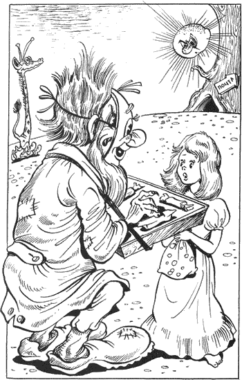 — Тогда подождем, — сказал Петька. — Это хорошее дело. Мы дождались Митьку и напомнили ему, что надо отвести нас к Главному коменданту. — Ладно, — сказал он. — Пойдем к Главному. Жидкость потом сварю. Дом Главного коменданта выглядел среди других самым оригинальным, потому что он был обыкновенной формы и некрашеный. Внутри дома тоже все было обыкновенно и привычно: стулья, лавки, стол, деревянная кровать и даже шкаф. На столе пыхтел медный самовар, кое-где помятый и начищенный до блеска. Три жителя сидели у самовара и гоняли чаи. — Опять ты, Митька, оригинальничаешь, — сказал один с нечесаными волосами, похожий на цыгана. — Кого привел? — Новенькие, из-за канавы, — сказал Митька. — Знакомьтесь. Мы познакомились. Похожий на цыгана оказался важным лицом — занимал в Мурлындии должность зампотеха, и звали его Федя. — Что такое «зампотех»? — спросила любопытная Лидка. — Наверное, заместитель по технической части, — сказал Петька. Кудреватый Федя громко рассмеялся: — Какая тут может быть техническая часть? Зампотех значит: «Заместитель Главного коменданта по потехам»! Глядите… Федя вытащил из-под стола старенький патефон, накрутил его и поставил пластинку. С двумя другими жителями мы знакомились под визгливые и хриплые звуки музыки. Лысого старичка с острой бородкой звали доктор Клизман. — Митька, ты выполнил задание? — спросил доктор. — Сырье уже принес, — сказал Митька. — Осталось сварить. Лидка задала вопрос: — Скажите, доктор, неужели в Мурлындии так много клопов и паразитов? Доктор Клизман отхлебнул чаю и сказал невесело: — Паразитов везде предостаточно, мое дитя… Главный комендант Степан Кузьмич, пожилой, со строгим, коричневым от загара лицом, сразу мне понравился, хоть и глядел сердито. — Ты зачем ногой дрыгаешь? — спросил он у Петьки. Тот не растерялся и заявил: — Может, я чаю хочу! — Если хочешь, — строго сказал Степан Кузьмич, — так попроси, а не дрыгайся. Садитесь к столу, жители!. Вот так, благодаря Петькиному нахальству, мы еще раз позавтракали. Я пил настоящий вкусный чай и думал: «Может, излишняя деликатность только вредит в жизни? Может, надо так, как Петька? Говорят же, что нахальство — второе счастье…» После чая мы пошли поступать в Лабаз. Много не разговаривая, по лесным тропинкам и ухабистой дороге мы дошли до громадного древнего дуба. Такой дуб и впятером, наверное, не обхватить. Меж его узловатых, удавообразных корней зияло мрачное отверстие, обложенное нетесаными каменьями. Обросшие мхом ступени вели вниз, в холодную глубину земли. Стало зябко… На поляне перед дубом тлело несколько сложенных костром сосновых стволов, рядом валялась груда смолистых палок. Главный комендант Степан Кузьмич зажег палки от костра, построил нас шеренгой и перед каждым воткнул в землю факел. Федя заиграл на патефоне медленную, торжественную музыку. — Теперь ступайте, — сказал Степан Кузьмич, — к доброму волшебнику. Степан Кузьмич достал из карманов три стеклянные банки, емкостью граммов по семьсот пятьдесят, наполненные живыми, копошащимися муравьями, и вручил нам. Зампотех Федя переставил пластинку, и зазвучал бодрый марш. Доктор Клизман махал платочком. Мы, взяв факелы, пошли за Главным комендантом вниз по замшелым ступеням… — Как интересно!.. — прошептала Лидка. — Жутковато… — поежился Петька. Я сказал: — В самом деле, припахивает