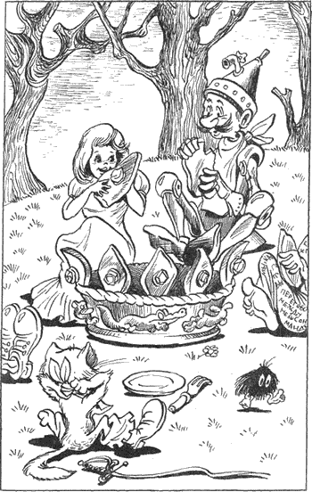 — Никогда еще так не опаздывали, — сказал доктор. — Ночь больно темна. Волны на море. Прунамель мог и сбиться с курса, — предположил Федя. — Не мог! — возразил доктор. — Прунамель отличный специалист. Он в любой темноте доплывет. Подбросив в костер несколько палок, Федя сказал задумчиво: — Хорошо быть специалистом… Делаешь свою работу, получаешь удовольствие… Никого надувать не надо. — Это конечно, — поддержал доктор. — Я тоже чуть не стал специалистом. Почти два курса училища прошел. Просто ужасно жалею, что бросил… Приходится теперь отравой торговать. — Не понимаю, — сказал Федя, — зачем нужна эта отрава. С муравьями все ясно, у них есть ценность. На муравьях фирма Лабаза три тысячи процентов дохода имеет… А зачем нужен отвар поганок, убей меня гром, не пойму! — Требуется! — важно сказал доктор Клизман. — И я предполагаю, что для военных целей! — Ах, военных, — произнес Федя. — Тогда понятно. Я замер под деревом, стараясь не пропустить ни одного слова. Вот оно, оказывается, что! Доктор тоже из этой шайки. Вот для чего ему нужны поганки. И с муравьями темное дело… В волшебство я давно уже не верил, но хитроумных пружин этого обмана не мог понять. — Побуду еще год-два в Мурлындии, — сказал доктор, — накоплю достаточно средств, да и уеду в цивилизованную страну. Буду жить в свое удовольствие на проценты с капитала. И стихи писать брошу! — Это обязательно надо, — сказал Федя. Я не понял, что обязательно надо: уехать из Мурлындии или бросить сочинять стихи?.. — А мне нельзя уезжать, — вздохнул Федя. — Куда я поеду с моим развитием? Мне только в Мурлындии и жить… — Девочка Лида школу устроила, — сказал доктор. — Походил бы, поучился. — Должность не разрешает, — покачал головой Федя. — А то непременно бы походил… Да и поздно уже. Скоро этой школе и всему прочему наступит… Раздался треск кустов. На поляну вышли трое в черных плащах с корзинами и фонарями. — Наконец-то! — воскликнули Федя и доктор в один голос. — Мы уж подумали, не случилось ли чего с кораблем! — Этот болван Прунамеля хотел пойти с нами к пещере, — сказал один из пришедших. Багровое пламя костра играло на его бородатой физиономии с кривым разбойничьим носом. — Едва отвязались! — Пришлось научить морячков играть в штосе, — сказал другой и захохотал. Я узнал навек запомнившийся мне голос разбойника Стропилы, который хотел нас повесить в лесном домике. — Морячки запалили факелы и дуются на кирпичи… Кикимор! Доставай угощение для сотрудников, — приказал Стропила. Низенький, косматый и кривоногий Кикимор распаковал корзину, достал оттуда консервы, сыр, колбасу, буханку белого хлеба и коробку мармелада. Все это он сложил у костра и поставил рядом три бутылки. У меня потекли слюнки. Захотелось выйти из-за дерева, угоститься колбаской. Но я понимал, что если я выйду, то угостят меня никак не колбаской… Поэтому я притаился еще незаметнее. А у костра началось пиршество. Особенно старались доктор и Федя. Они пили прямо из горлышек, широко разевали рты и жадно кусали еду. Доктор то и дело стряхивал с бороды крошки. — Вы там небось каждый день так трескаете? — завистливо спросил зампотех Федя. — Каждую ночь! — уточнил Кикимор. — Днем мы спим, восстанавливаем силы. Если б не эти дежурства в пещере, совсем райская житуха была бы. Верно я говорю, Стропила? Длинный и безбородый Стропила швырнул в м