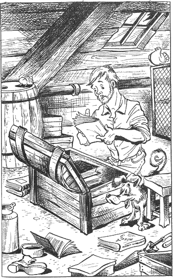 Житье началось просто прекрасное. Утром бежали на море, купались и загорали. Потом шли в лес. Я собирал грибы, а Мартын играл в дикого зверя. Он кого-то ловил, разгребал кочки, совался во все норы и по самый хвост залезал в гнилые пни. Вечером я читал простые и интересные книжки, а Мартын догрызал косточку от ужина. Так мы жили в свое удовольствие дней десять. Потом зарядили тягучие, беспросветные дожди, небо стало серым, а земля мокрой и неуютной. Я подумал, не пора ли обратно в город, но старушка отсоветовала: не вечно дожди лить будут. Мы остались. В какой-то день дождь лютовал особенно сильно. Тяжелые капли барабанили в окна, а ветер дул с такой силой, что вздрагивали стены. В моей комнате стал протекать потолок. — Слазай, милый человек, на чердак, — сказала мне старушка. — Погляди, не прохудилась ли крыша. Забрался я на чердак по узкой лесенке, гляжу — и вправду дыра. Я взял в сарае тесу, заложил дыру, подтер лужу и собрался вниз идти. Шагнул — и заметил сундук. Совсем черный от древности возраста, обит медными полосами и крышка корытом. Я обожаю всякую старину. А если увижу старинный сундук, так уж непременно загляну, что в нем спрятано. А вдруг какая-нибудь ветхая музейная редкость? Поднял я крышку и очень разочаровался. Никакой не было в сундуке музейной редкости, а лежали одни только школьные учебники и тетради. Из любопытства перебрал книжки: «История», «Ботаника», «География», «Арифметика» и все тому подобное прочее. А тетради давние, чернила выцвели, только одни отметки красным карандашом хорошо сохранились, навеки. Огорченно вздохнул я, стал укладывать это хозяйство обратно — и вдруг заметил на самом дне стопку тетрадей, перевязанную веревочкой. И тут опять застучало мое сердце, и я понял, что напал на необычное. Развязал веревочку, раскрыл верхнюю тетрадь и прочитал на первой странице такое предложение: «Достоверные записки ученика седьмого класса Миши Губкина о необыкновенном путешествии в Мурлындию, страну мудрецов, которое случилось этим летом…» Удивился я. Никогда не слыхал про страну Мурлындию, хоть знаю географию вполне удовлетворительно. Сундук я закрыл, а тетради взял с собой в комнату. Дело было к вечеру, дождь все царапался за окном. Деревья шумели, рокотало близкое море. Мартын беспечно спал на диване и дергался, когда на нос ему садилась муха. Я сходил на кухню, принес чайник. Сел поудобнее, налил чаю в большую кружку и раскрыл первую тетрадь…