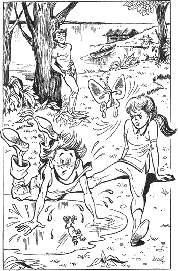 Ночевали в Митькином доме. — Вот вам сено, мешок и одеяло, — сказал Митька. — И спите как умеете. Одеяло отдали Лидке, а мешком мы с Петькой прикрылись вдвоем, и я сразу заснул, как провалился, и спал без всяких сновидений до самого утра. Дома, просыпаясь, я слышал запах кухни. Как раз в это время бабушка готовила завтрак. А здесь, проснувшись, я почувствовал запахи травы, теплой земли и полевых цветов. Это было здорово, как в сказке. Ночью Петька, конечно, стащил с меня мешок. Но мне было тепло и радостно от утреннего солнца, от беспредельной свободы, и я не щелкнул по носу Петьку. Я был добр просто до неприличия. «Пусть, — подумал я, — спит, пока сам не проснется. Пусть спит, пока не надоест. Может, ему сейчас снится интересный сон. Пусть смотрит и веселится. Спи, Петька, спи, глотатель фиолетовых чернил, тысячу раз поротый материнским ремнем угнетенный землекопатель, а ныне вольный житель страны Мурлындии Петька! Сопи носом, подлец Петька, стащивший мешок с товарища и завернувшийся в него сам! Спи, дуралей, я тебя прощаю». Постель Митьки-папуаса была пуста. Лидка сидела у входа, гляделась в зеркальце и расчесывала свои желтые волосья. Услыхав, что я поднимаюсь, она сказала: — Хозяин дома оставил нам лепешку и соли в тряпочке. — А сам куда делся? — Пошел собирать грибы-поганки, — сообщила Лидка. — Ему доктор заказал целое ведро жидкости от клопов и паразитов. — Неужели в Мурлындии так много клопов? — Меня не кусали. — Меня тоже. Давай выкладывай Митькину лепешку! — Сперва умойся, — сказала Лидка, не переставая глядеться в свое зеркальце. — Ручей рядом. Мне не понравился ее тон. Я произнес строгим голосом: — Днем пойдем купаться. Гони лепешку! — Топай, топай, — спокойно сказала Лидка. — Не хватало мне еще с немытыми за стол садиться. Раздался Петькин голос: — Где стол? Какой стол? Уже завтракают, что ли? — Поднимайся, лодырь! — скомандовал я. — Пошли умываться.