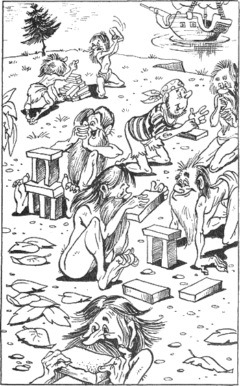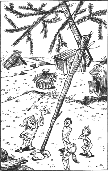 Через три дня все забылось. Единственным напоминанием о Петькиной затее остался медный шлем на голове у Кирюхи (алебарду король у него отобрал, и я снова превратил ее в топор). Да еще Главный комендант Степан Кузьмич в ту ночь свалился с крыши, здорово стукнулся головой и теперь лежал в постели не поднимаясь. Говорил он с трудом и дышал тяжело. У меня появлялись сомнения, что не с крыши свалился Степан Кузьмич, но я не давал им воли… — Кого же теперь назначить Главным комендантом? — беспокоился король Мур. — У нас дураков нет работать… Жители продолжали заниматься мелкими делишками и развлекались по способности. А мне вдруг стало скучновато в Мурлындии. Хотелось что-то выдумать — радостное, как мир, который видишь, проснувшись ранним летним утром… Пусть даже за это побьют камнями. Король, конечно, прогнал Петьку из дворца, нам пришлось перебраться к Митьке-папуасу. Лидка сказала: — Мальчики, пора строить дом. Не жить же все время у Митьки! Митька был радом и учил ежика ходить на задних лапах. Возражать он не стал, и мы поняли, что поднадоели… — Пора, — без восторга согласился Петька. — Никуда не денешься. Предлагаю строить круглый, как у Митьки. — А круглый дом трудно построить? — спросил я. — Легче легкого! — сказал Митька, спрятал ежика в мешок и приступил к объяснению: — Начинаешь с того, что рисуешь на земле круг. Потом через каждые три шага забиваешь по колу. Потом натаскаешь длинных веток, сплетешь между кольями плетень, оставив в нем пять дырок: одну для двери и четыре для окон. А дальше — совсем пустяки: намесишь глины с травой и обмажешь стены. Поставишь сверху крышу. Как делать крышу, я потом расскажу. Боюсь, что сразу ты всего не запомнишь.