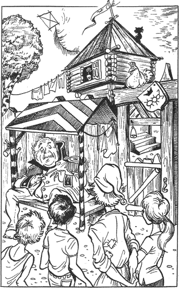 Жители утихли, и Кирюха перестал махать алебардой. Его величество король Мур Семнадцатый стал в позу и подробно рассказал жителям, какое теперь у нас будет королевство и у кого из нас какая должность. — Ловко придумано! — одобрили жители. — Веселая игра! Потом вышел я и сказал так: — Каждый житель за право участия в игре будет отдавать в казну королевства десятую долю того, что получит в Лабазе. Это будет государственный налог. Кому жалко, может сидеть дома! — За интересную выдумку ничего не жалко, последнюю рубаху отдадим! — согласились жители. — Эй, король, говори, что теперь делать? Король сказал: — Сейчас генерал Евтихий навербует из вас армию и вооружит дрекольем. Потом двинемся в поход. Завоевывать неведомое царство! — Ура! — закричали жители. — Давно бы так! Где твоя голова раньше была? — Нужен случай, чтобы проявить свои дарования, — скромно сказал король. Армия была навербована и вооружена за два часа. Министр мудрости Аркадиус, пользуясь палочками собственного изобретения, насчитал в войске семьдесят девять солдат. — А не сто! — гордо сказал он королю. Королева, Лидка, Степан Кузьмич и Федя в армяне не вступили. — Мне в походе делать нечего, — сказал премьер-министр. — Мне и в родном государстве делов хватит. И он опять чуть заметно ухмыльнулся. Капитан Прунамель тоже захотел остаться, но доктор Клизман увлек его разговорами, а когда капитан стал очень уж упираться, обещал где-нибудь на походном привале научить его играть в покер. Капитан соблазнился и остался при войске. Евтихий выдал ему лук и стрелы. Министры уговаривали его величество потерпеть до утра, но король загорелся и велел выступать в поход немедленно.