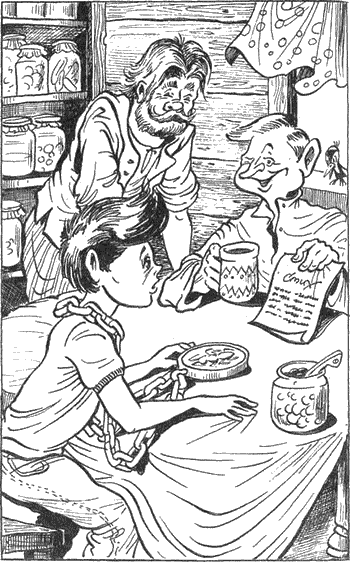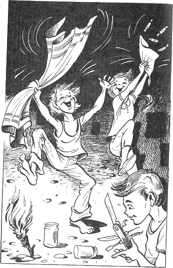 Сидя у разбойничьего костра, пленники совершенно не знали, что предпринять. — Надо у атамана отнять пистолет. — Поджечь хижину. — Но ведь тогда сгорят разбойники, — сказала Полина. Ни одно предложение не прошло. Ледышка трясся всем телом. У него от страха еще раз замерз снег в карманах и превратился в сосульки. Он отламывал их и сосал, рискуя заболеть Северным Полюсом. Бумажный прошелестел: — В газете ничего чрезвычайного не сообщается. — Он сделал вид, что продолжает читать газету и немедленно уронил ее в огонь. Тоща Бумажный зажмурился, надеясь, что если темно изнутри, то и снаружи меньше заметно. — Неужели от моего былого рыцарства осталась только эта рисовая побрякушка! — тряхнул цепью Железный.