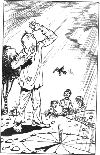 — Плевал я на еду! — орал Петька, который еще никогда не плевал на еду. — Попрошу у волшебника гитару, сяду посреди улицы и буду играть! Хватай банки! Треща и дымя, догорали наши факелы. Мы выбежали из пещеры окончательно счастливые. Первого муравья изловил Петька. — Есть один рыжий! — крикнул он и отправил зверя в баночку. Пока они попадались по одному, собирать было даже интересно. Но по солнечным поляночкам они ползали десятками, сотнями и целыми колониями. Это, конечно, красиво — смотреть на сверкающий золотой ручеек, но охотничий интерес пропал. Сразу заболели спины, а баночки наполнялись медленно, и конца этому делу не было видно. — Наверное, у жителей есть какой-нибудьспособ, — сказала Лидка. — По штучке и за день банку не наберешь. Подумаем? — Ну, подумаем… — согласились мы с Петькой.