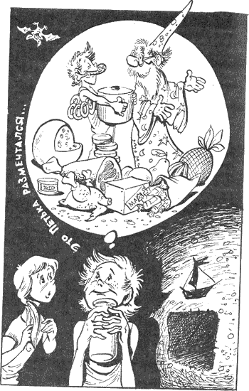 — Ты больше всех моих конфет слопал! — сказала Лидка. Петька притих и стал жевать веточку. А банки скоро наполнились. У костра около волшебной пещеры сидел симпатичный доктор Клизман. С уважением посмотрев на наши полные банки, он дал нам по факелу и похвалил за старательность, потому что знал, каким мудрым способом мы собрали муравьев. — А как вы на них охотитесь? — ядовито спросил Петька. — А я и не охочусь, — покачал головой доктор Клизман. — Потому что я занят в сфере медицинского обслуживания жителей. — А материальные блага из пещеры вы получаете? — спросил я. — Когда все здоровы, тоща получаю. Но если кто так серьезно заболеет, что не сможет собирать муравьев, тоща не получаю, пока не вылечу жителя. — Значит, когда не работаете, тоща получаете, а когда работаете, тоща не получаете? — удивился Петька. — Вот именно, — сказал доктор Клизман и потряс бородкой. — Поразительная страна! — воскликнул Петька и пошел в пещеру. Мы спустились в сырое подземелье, и снова стало жутковато. Но теперь мы знали, что волшебник работает честно. Петька сунул банку в камеру и произнес замогильным голосом: — Дорогой Лабаз! Я со вчера ничего не ел, у меня живот к спине прилип и кишка кишке бьет по башке. Я набрал полную банку муравьев, затратив необыкновенное количество труда и усилий. Дай мне за это кило колбасы, полкило сыру, кило вареного мяса, кило шоколадных конфет «Мишка на севере», три пачки печенья «Мария» и жареную курицу. Не очень много за полную банку, да? Завтра я тебе еще наберу. Спасибо, добрый Лабаз. — Это ты на всех попросил? — поинтересовалась Лидка. — Вот еще! — сказал Петька. — У вас свои языки есть. Поставив баночку в камеру, Лидка сказала: — Дорогой волшебник Лабаз! Я очень люблю вкусные вещи, но я понимаю, что ты все даешь даром, и мне стыдно только за одно спасибо просить слишком много. Дай только большую сладкую булку, еще конфет «Золотой ключик», немножко чернослива и пачку чая. Спасибо, добрый Лабаз! — С такой пищи ноги протянешь, — сказал Петька. — Как бы кому-то из нас не пришлось протягивать руку! — сказал я, поставил в камеру банку и, подумав, попросил: — Добрый Лабаз, во-первых, дай мне спичек. А из пищи: картошку, сахар, хлеб и помидоры. Я их очень люблю. Дай еще мяса и лопату. Все. Спасибо. Переночевали мы опять у Митьки. Голод терзал жестоко, потому что вечером съели только по две картофелины и одну лепешку на троих. Утром кое-как сполоснулись в ручье и отправились в волшебную пещеру. Было тепло и тихо. Приветливо светило невысокое еще солнышко, и настроение у нас было, в общем, хорошее. Даже шкодник Петька подобрел и не сломал по пути ни одной ветки. Он свистел красивые песни, а когда уставали губы, мечтал вслух, как вынесет из пещеры всю еду, разложит вокруг себя на полянке и будет лопать, лопать и лопать, пока живот не раздуется шире дивана. Слушая его завлекательные речи, мы глотали слюнки и начинали жалеть, что попросили так скромно. Конечно, мы не надеялись, что Петька с нами поделится. Около костра никого не было, он едва тлел. Петька опять удивил нас: набрал хворосту и подкинул в костер. После этого мы запалили факелы и спустились в подземелье. Петька сунул руку в свою камеру, долго там шарил — мы подумали, что ему никак не вытащить, и вдруг заорал: — Нету!!! Он повернулся к нам. Оранжевый огонь факела освещал растерянное лицо и трясущуюся ни
