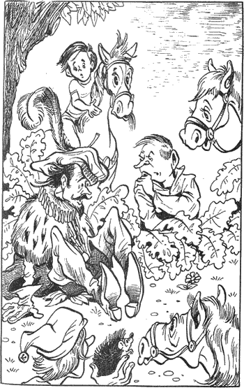 Митька размотал мешок, вытащил оттуда ежа и протянул королю Муру. Королевская лошадь скосила глаз на колючего зверя, заржала и отскочила в сторону. Бедный его величество полетел из седла вниз берегом. Раздался сердитый крик: — Чтоб тебя, осла коронованного… И еще какие-то слова, которых мы не разобрали. С земли король поднялся не один. Радом встал, морщась и потирая плечо, незнакомый житель, причесанный и в целой рубашке. Мы раскрыли рты от удивления. Первым опомнился король Мур. — Кто ты таков? — строго спросил он у незнакомого жителя. — Я всех в Мурлындии знаю, а тебя первый раз вижу. — Ни разу бы не увидели, ваше величество, если б не этот клопоморщик со своим дикобразом. Желаю счастливого пути! И незнакомый житель исчез в кустах. Король спросил у Митьки: — Скажи, любезный, ты когда-нибудь встречал этого жителя? — Никогда! — ответил Митька. — Он, наверное, такой глупый, что стыдится на глаза показываться. Ежика дикобразом назвал. — А тебя клопоморщиком, — напомнил невоспитанный Петька. — Тоже глупо, — сказал Митька. — В общем, я его не знаю и ничуть об этом не жалею! Он замотал ежика обратно в мешок и зашагал по тропинке, напевая свою веселую песню: