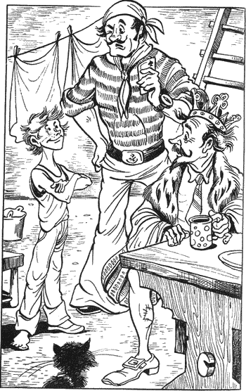 — Вижу плавающий предмет! — громко крикнул Кирюха. — Докладывай, в каком направлении! — сказал капитан, задрав голову и уперев руки в бока. — Вижу плавающий предмет сзади на длинной веревке! — доложил Кирюха по всем правилам. Мы кинулись на корму. Привязанный к румпелю длинным канатом, за «Диогеном» тащился плот, тот самый, на котором прибыли в Мурлындию мудрецы с острова. На плоту, крепко обнявшись, спали Стропила и Кикимор. Капитан Прунамель очень рассердился, увидев такое. — Эй, на плоту! — рявкнул он. У меня зазвенело в левом ухе. Летевшая неподалеку чайка камнем упала в воду. Стропила и Кикимор зашевелились, раскрыли глаза. — Уже утро, — сказал Стропила. — Капитан зовет нас завтракать. — Крепко сказано: завтракать! — повторил Кикимор, щурясь на восходящее солнце. Капитан Прунамель впал в ярость: — Я тебе сейчас покажу точное время суток! Ты у меня увидишь и завтрак, и полдник, и пятичасовой чай! Как ты смел прицепиться, да еще к румпелю?! — Люблю путешествовать, — сказал Стропила. — Особенно я обожаю морские путешествия в тихую погоду. — Эмигранты безродные! — взорвался капитан Прунамель. — Будете путешествовать до конца своей никчемной жизни! Эй, матросы, рубите канат! — Отмени приказание, капитан, а то пойдешь под суд, — спокойно сказал Стропила. — За что это? — удивился капитан Прунамель. — За то, что не оказал помощи терпящим бедствие на море! Капитану пришлось согласиться: — Твоя правда, пират эдакий… Закон так и гласит. Но я тоже найду на тебя закон! Отдам тебя под суд за то, что прицепился к судну без разрешения капитана, не имея документов на выезд.