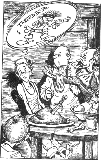 — Корону с него снять, — подсказал Петька. — Она золотая! — Тоже мне сокровище! — скривился Стропила. — Я предпочитаю мягкие шляпы. — Крепко сказано: мягкие шляпы! — повторил бородатый Кикимор. — Мы очень жестокие разбойники, — сказал Стропила. — Пожалуй, мы вас все-таки повесим. Вяжи их, Кикимор! Свирепый Кикимор связал нас по рукам и по ногам. Петька рыдал. Аркадиус усиленно думал. Король Мур приготовился принять смерть с королевским достоинством и следил только за тем, чтобы не перекосилась на голове корона. — Послушайте-ка, уважаемые разбойники, — сказал связанный Аркадиус ровным голосом, в котором не чувствовалось и признака боязни. — Я не знаю, в каких отношениях находитесь вы с Лабазом, и не собираюсь об этом задумываться… Разбойники насторожились. — Но я уверен, — продолжал Аркадиус, — что если вы нас вздернете, то огорчите волшебника. После этого от вашей шайки останутся только клочья бороды Кикимора! Разбойники засунули ножи за пояса, стали в кружок и посовещались. Потом Стропила подошел к нам и сказал: — Времени на вас нету. И так зачахнете от голода! Опрокидывая лавки, разбойники вышли из дома, а мы остались, связанные, на полу. Петька перестал рыдать и облизнулся: — Сколько еды оставили! Надо скорей развязываться! Но свирепый Кикимор затянул нас такими узлами, которые не поддавались даже крепким Петькиным зубам. — Лучше уж сразу быть повешенным, чем медленно чахнуть от голода, — сказал Петька, всхлипывая. — Не наводи уныния, — сказал Аркадиус и пополз к двери. Он стал тереть веревку, связывавшую руки, о край доски. — Нет пределов твоей мудрости, Аркадиус! — сказал король. Примерно через полчаса работы веревка перетерлась. Аркадиус смахнул со лба капли пота, вынул из моего кармана знаменитый нож и освободил нас от пут. Первым делом мы наелись. В бутылках разбойники, правда, ничего не оставили, но конфет, мяса, печенья и яблок было вполне достаточно. — Хорошо едят разбойнички! — позавидовал король Мур. — Не родись я королем, пошел бы к ним в шайку. — От такой пищи и верблюд не откажется, — сказал Аркадиус. За окном уже светало. — Может, поиграем в разбойников? — предложил повеселевший от конфет Петька. Король Мур бросил на него презрительный взгляд. Подкрепившись разбойничьей пищей, мы поплелись домой через дремучий, пахнущий гнилью мурлындский лес. Вскоре мы уже были в Мудросельске. — Будем жить тихо, мирно, в свое удовольствие, — повторял король Мур Семнадцатый. — Кто ничего не выдумывает, того не бьют камнями!