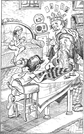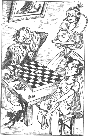 Старик все еще не вставал с постели. — Мне вот что не понятно, — сказал я, согрев самовар и налив по кружке чаю. — Сейчас лето, погода теплая, дожди редко идут. А наступит осень, потом зима. Что жители будут делать? Ведь у них дома ветерком насквозь продуваются, печек нет, одежда легкая и вся в дырах. Замерзнут небось жители? Степан Кузьмич покачал головой и сказал: — Жители на зиму спать ложатся, наподобие медведей. Закапываются в сено и засыпают. Спят таким образом до самой весны, когда солнышко сызнова тепло греть начнет и желтые муравьи из муравейников повылезут. Жители просыпаются, отощав, налавливают муравьев и бегут в Лабаз. — Не может такого быть! — воскликнул я в удивлении. — Именно так, — сказал Степан Кузьмич. — Сейчас август кончается. Месяц-полтора жители побегают, попляшут, а там станут к зиме готовиться, сено в дома носить. В ноябре никого уже не встретишь на улице. — И вы… спать будете? — спросил я, сомневаясь. — Где-нибудь и я спать буду, — сказал Степан Кузьмич с тяжелым вздохом. — Что-то худо мне Миша… Зашел Федя, зампотех, и кинул на меня подозрительный взгляд. — Вот ты где, — сказал Федя. — А я ищу! — Зачем? — Король завет. Что ты там еще придумал? — Пока ничего не придумал, — сказал я. — Если придумаешь, помни наш уговор! — сказал Федя и ушел. — Сходить к нему, что ли… Ведь в Мурлындии король существует для формы, просьбы его не обязательны, каждый волен поступать, как ему заблагорассудится. — Сходи, — сказал Степан Кузьмич. — У меня будет поручение личного характера… Передай Муру, что здоровьишко мое очень уж плохо. Пора назначить нового Главного коменданта. Эти хлопоты уже не по мне. Пусть доктора поставит или Федю. Они в курсе дела, что и как. Могут исполнять должность. — Хорошо, передам, — сказал я. — Только вы не унывайте, Степан Кузьмич. Выздоравливайте скорее. Король Мур сидел в печальной позе, сунув ногу под кресло и вытянув вперед другую. Волосы его растрепались, а золотая корона валялась на полу самым непристойным образом. Я поднял корону, положил на столик и спросил: — Что с вами, ваше величество? Не случилось ли несчастья? — Всю ночь заснуть не мог, — пожаловался король. — Шахматы мне вспомнились. До утра рассказывал королеве, какая это мудрая игра. Миша, научи меня трать в шахматы! Я развел руками: — Как же можно научить, если шахмат нету? — Ты их сделай! Долго ли умеючи? Скажи, что для этого нужно, — я велю зампотеху добыть материалы и инструмент. — Ладно, ваше величество, — согласился я. — Мне самому интересно. Предоставьте мне квадратную доску, длинный брусок и две краски: черную и желтую. Остальное есть. Вскоре Федя принес мне краски, доску и брусок. Вид у зампотеха был расстроенный. — Что за новую потеху придумал? — спросил Федя. — Шахматы. Это не я придумал — король сам попросил. — А для чего они, эти… шахматы? — спросил Федя. — Игра такая, — объяснил я. — Индийского происхождения. — Ах, индийского! — сказал Федя. — Ну, тогда делай шахматы. Зампотех немного посмотрел, как я режу деревяшки, но скоро ему надоело, и он пошел прочь. Фигуры я мастерил часа четыре. Потом час чертил на доске клетки и красил. Пришел сонный часовой Кирюха и начал ругаться: — Одна с тобой морока и трепка нервов. То на новоселье к тебе иди, то посылают… Скоро ты эти пешки королю представишь? Он мается, места не находит. Весь компот еще горячим выпи