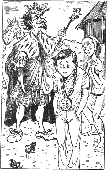 — Сторож… — тихонько сказала нам Лидка. Митька-папуас обратился к этому сторожу: — Здорово, Кирюха. Мы к королю. Сторож посмотрел сонными глазами на Митьку, потом скользнул взглядом по нашим запыленным фигурам и сказал ленивым голосом: — Мне-то что. — Он дома? — спросил Митька. — Куда он денется, — зевнул сторож. — Третий день не выходит. Посадил в горшке цветок георгин. Наблюдает, как он там растет… — А сорок не стреляет? — Бросил, — сказал сторож Кирюха. — Ступай, Митька, не отвлекай отдела. Видишь, я занят. Мы миновали двор, поднялись на крыльцо и зашли в темный коридор. Митька уверенно толкнул одну из дверей, и мы очутились в комнате. На кресле с прямой высокой спинкой сидел тощий житель с печальным лицом, одетый в темно-красный плащ, черные брюки и туфли с пряжками. Голову печального жителя украшала золотая корона. Большие внимательные глаза смотрели в одну точку — на глиняный горшок, из которого торчала травинка. На нас он не обратил внимания. — Здорово, ваше величество, — почтительно произнес Митька. — Здорово, а? Его величество неохотно отвел взгляд от травинки, приподнял голову и сказал тихим, глубоким голосом: — Здорово, любезный Митька. Давненько не заходил ты в гости к своему единственному королю. И сними этот скомороший колпак. — Извиняюсь, ваше величество, — рявкнул Митька и сдернул колпак с головы. — А не заходил я в гости потому, что пропитание себе зарабатывал. — И тут работают… — шепотом огорчился Петька. Его величество склонил голову к левому плечу и спросил: — Чем же ты теперь занят, любезный оригинал? Что делаешь? — Делаю жидкость, ваше величество! — отрапортовал Митька. — Оригинально, — сказал король. — Только стоит ли? Собирал бы муравьев, как все жители. Митька развел руками: — Не могу, ваше величество. Душа не лежит. — Душа… — произнес король и задумался. — Ну, ладно. Делай жидкость. Кстати, что это за жидкость и для какой надобности? — Жидкость от клопов и паразитов, — сказал Митька. — Как же ты ее делаешь? — Набираю в лесу грибов-поганок и варю. Два часа варю, три часа варю, потом сливаю, — разъяснил Митька. — И очень хорошо помогает. Польешь тюфяк — ни одного паразита не останется, ни жука, ни комарика. Которые дохнут, а остальные разбегаются. — Фу, фу, фу, — сказал его величество и заткнул уши указательными пальцами. Петька повеселел и шепнул мне: — Так-то работать можно. Король вынул из левого уха указательный палец и спросил: — А кому ты эту жидкость сбываешь и за какой барыш? — Доктор берет, — сказал Митька. — За банку жидкости дает лепешку, мерку картофеля и полгорсти соли. Новые штаны посулит! — Кучеряво! — оживился король, но тут же его лицо снова опечалилось. — Но собирать муравьев было бы выгоднее. — Душа! — развел руками Митька-папуас. — Ах, душа… — вспомнил король и загрустил. Погрустив немного, он спросил, указав на нас длинным пальцем: — Что за жители? Наконец-то на нас обратили внимание… — Новенькие, — сказал Митька-папуас. — Я их из-за канавы привел. Очень желают жить в Мурлындии, стране мудрецов. Мы сказали: «Здрасте, ваше величество» — и назвали свои имена. Его величество тоже представился: — Мур Семнадцатый, единственный король в Мурлындии… Много ко мне приходило новеньких, но в большинстве это оказывались скучные жители… Может, и от вас проку не будет в Мурлындии? — Не утруждайтесь сомневаться, ва