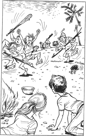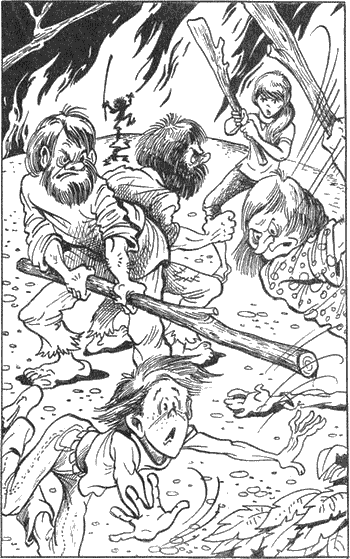 Жители уже не метались по улицам. Они собирались толпой вокруг кого-то. Я присмотрелся и узнал зампотеха Федю. Он указывал рукой на наш дом. — Бежать вам надо не к ним, а от них, — сказал Шнырь. — Я не ручаюсь за сохранность ваших голов. Я все понял! Разрозненные события последних дней — от поездки короля и Феди на остров Высшей Мудрости и до вчерашнего визита королевы — выстроились в непрерывную прочную цепь. — Это поджог! — крикнул я. — Поджог, — спокойно кивнул Шнырь. — Прунамель рассказывал вам о поездке короля и Феди к Главному… — И Главный мудрец посоветовал им поджечь дома, в которых я ставлю печи?! — Совершенно верно, — подтвердил Шнырь. — Как только наступит холодное время… Выдумка не очень гениальная, но действует безотказно. Простейшая связь: огонь в печи — огонь на крыше. Что еще надо для здешнего жителя?.. Смотрите, толпа двинулась сюда, чтобы с вами расправиться. Бегите! — Эх, Шнырь, Шнырь… — произнес я в отчаянии. — Не могли разузнать об этом раньше! Я бы принял меры. — Вы плохо обо мне думаете, — невесело усмехнулся Шнырь. — Вы… знали? — закричал я. — Значит, вы на их стороне? — Бросьте кипятиться, — сказал Шнырь. — Я на своей стороне, больше ни на чьей. Но я никому не желаю зла и повторяю: бегите! — Но почему вы ничего не сказали? Неужели эта беда вас очень радует? Вдруг Шнырь взорвался: — Слушай, мальчишка! Если бы ты осуществил свои планы, мне стало бы нечего делать в Мурлындии! Пришлось бы погибать со скуки, наняться в артель каменщиком, а по вечерам петь баритоном в самодеятельном хоре. Я терпеть не могу самодеятельность. Я специалист высокой квалификации — ты имел возможность убедиться в этом. Пусть все остается по-старому. Но я не хочу ала вам лично и повторяю: бегите. Еще не поздно! Впереди мчались Федя, доктор Клизман и Грызушка. В руках у них были тяжелые дубины. В стороне растерянно переминались с ноги на ногу бывшие мудрецы. — Куда же бежать? — спросил я, подняв глаза к потолку. — В Мурлындии нам негде укрыться. — Некуда нам бежать, — сказал Петька. — На берег! — произнес Шнырь. — Спасибо за вкусный компот, милая Лида. Никогда не забуду. И Шнырь исчез. — Правильно! — Я понял его мысль. — Бежим к капитану! Мы выскочили из дому. Толпа была уже совсем близко. Дубины взметнулись над нашими головами. Я пригнулся и ударил зампотеха головой в живот. Федя свалился, но тут доктор обрушил мне на спину свою суковатую палку. — Отек легких! — сказал доктор. — Принимаю завтра после обеда. В ту же секунду ему в лоб попал кирпич, брошенный Петькой. Охнув, доктор Клизман улегся на землю. — По меньшей мере шишка! — крикнул я, разгибаясь. Грызушка огрел Петьку дубиной. Лидка подхватила суковатую палку доктора и стукнула Грызушку по шее. Тот застонал и улегся рядом с доктором Клизманом. Острый камень рассек мне скулу. Десятки глоток ревели: — Бей его палками! Круши ему кости! Он поджег наши дома! Мы отступили за груду кирпичей. Я и Петька швыряли кирпичи в нападающих, и они по одному выбывали из строя. Обе стороны осатанели, и бой разгорелся не на шутку. Вступить в какие-либо переговоры не было никакой возможности. Наши кирпичи попадали метко, но разъяренных жителей было слишком много. Они окружали. Мы швырнули еще по кирпичу и побежали к лесу. Оправившийся от удара Федя догонял меня, занеся над головой дубину, как казак шашку. Я слышал его хриплое 