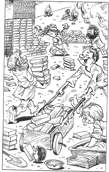 Придя к ручью утром третьего дня, я увидел, что жители, ругаясь и отвешивая друг другу подзатыльники, пытаются разделить кирпичи. Я самым решительным образом пресек это безобразие и велел еще работать. Только на пятый день, когда кирпичей накопилось достаточно, я разрешил взять — кто сколько унесет за два раза… В стране Мурлындии началась кирпичная лихорадка. Жители валили ко мне толпами, просились работать. Они построили сарай, куда я складывал продукцию. Из каждой сотни сделанных кирпичей я давал жителю десять, остальное отправлял в сарай. Житель хватал заработок и говорил «большое спасибо», а на его место приходил другой. Мой сарай наполнялся строительным материалом. — Куда тебе столько? — дивилась Лидка. — Дом! — высказал я свою заветную мечту. — Понимаешь? — Понимаю, — сказала Лидка, хотя вряд ли она понимала всю грандиозность моих замыслов. Королю я подарил сто кирпичей. Мур забросил охоту и шахматы: он целыми днями играл в кирпичи, строил стены и башни, возводил дома, замки и крепости. Построив крепость, Мур говорил: — Вот в какое неведомое царство надо играть! Его можно завоевать без всяких хлопот и увечий! Иногда он играл с королевой в «кто больше кирпичей поставит друг на дружку». Дылда выиграла у него все кирпичи и выложила ими дорожку в саду. Печальный король пришел ко мне просить еще. Но у меня был принцип. Только придерживаясь его, я мог исполнить мои грандиозные планы. — Придется поработать, ваше величество, — сказал я королю. — Сотню я вам подарил в виде исключения, как коронованной особе. Больше не могу. Не надо было проигрывать. Мур Семнадцатый заткнул попы мантии за кушак, нахлобучил корону и работал на общих основаниях. Король не ленился. За два дня он заработал семьдесят четыре кирпича. Мое сердце размягчилось, и я добавил ему двадцать шесть — как премию за усердие. Кирпичная лихорадка трясла страну Мурлындию. Жители играли только в кирпичи. На моем заводе было уже сто формочек, и ни одна не валялась без дела. Жители построили второй сарай. Он быстро наполнялся, и я велел строить третий. Кирпичей жителям требовалось все больше, потому что они совершенствовали игру и научились возводить наисложнейшие фигуры. Трудились даже ночью. Над берегом ручья пылало зарево. Капитан Прунамель привел своих матросов. Они заработали по сотне кирпичей и погрузили их на телегу, сияя от счастья. Я спросил капитана: — А как же карты? Ведь восьмивековая традиция… — Традиция традицией, а мода модой, — сказал капитан. — Одно дополняет другое, и жизнь приобретает гармоничную цельность. Всякая традиция когда-то была модой, не так ли? Жители очень неохотно тратили время на ловлю муравьев. Кирпичи стали монетой. Установился курс. За восемь штук давали теплую лепешку. За двадцать кирпичей житель снимал рубаху и еще считал, что ему повезло. Грызушку я назначил начальником охраны кирпичных складов, и он добросовестно служил за сорок восемь кирпичей в неделю. Лидка тоже не терялась. Она нанимала жителей на уборку улиц и давала по десять кирпичей за рабочий день. От желающих не было отбоя. Улицы в Мудросельске засияли чистотой, как полы у хорошей хозяйки. Лидка решила озеленить город и объявила, что даст пять кирпичей за каждое пересаженное дерево. Сбежались желающие, и через три дня улицы Мудросельска были обсажены березками, кленами, липами и т
