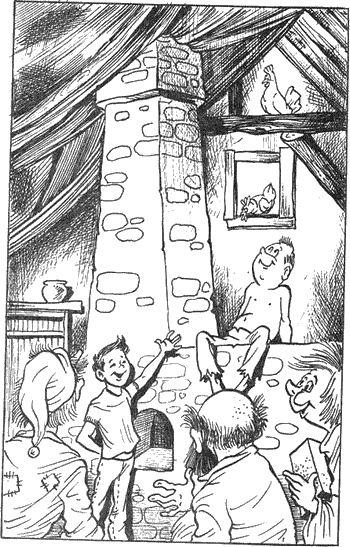 Я решил прогуляться на завод. Вышел, прикрыл дверь, но не успел сделать шага, как мне на голову спрыгнул зампотех Федя. Минуту мы в изумлении глядели друг на друга. Федя сказал: — Извините. Чуть не зашиб. — Что ты делал на моей крыше, заместитель? — строго спросил я. — Эээ… — замялся Федя. — Смотрел, какая в трубе дырка. — Зачем тебе это понадобилось? Федя уже оправился от смущения и ответил нахальным тоном: — Может, я сам собираюсь печку построить. Нельзя же браться за дело, не посмотрев на предшествующий опыт! — Брось выкручиваться, заместитель, — сказал я. — Никакой печки ты строить не собираешься. Ты подслушивал! У тебя все лицо в саже, особенно уши. Признавайся, какую ты задумал каверзу? — Клянусь, ничего не задумал! — упирался Федя. — Я захотел построить печку. Люблю, когда в доме тепло! И тут мне пришла в голову такая мудрая мысль, что я даже улыбнулся и ласково погладил медаль у себя на груди. — Прекрасно, заместитель, — сказал я Феде. — Верю тебе и помогу. С завтрашнего дня будешь работать каменщиком в артели. Обязанности зампотеха можешь пока не исполнять… Впрочем, ты их и раньше не особенно исполнял. Федя сразу сник, цыганские глаза его померкли. — Я не умею работать каменщиком, — сказал Федя. — Я не буду… — Значит, тебе не нужна печка? Зачем же ты лазил на крышу?! — Нужна! — воскликнул Федя. — Я буду работать каменщиком. Вот только справлюсь ли… — Справишься, — сказал я. — Работа не умственная. За день работы будешь получать десять кирпичей. Доволен? — Очень благодарен, — пробормотал Федя и поплелся в сторону королевского дворца. Наверное, решил посоветоваться, как ему теперь быть. Своего соображения Феде всегда не хватало. Накрапывал дождик. Жители вяло бродили по улицам, загребая ногами грязь. Многие тащили охапки сена и листьев. Петька домой не являлся. Где он теперь жил и чем промышлял, — это было известно только Шнырю, но он нам с Лидкой не рассказывал. Я стал подозревать, что Шнырь многого нам не рассказывает. Вечерами он появлялся в нашем доме, пил брусничный компот, выкладывал нехитрые мурлындские новости. О секретных замыслах короля и Феди он не говорил ни слова. О том, какие дела творятся в волшебной пещере, он тоже молчал. Не мог же он этого не знать! Значит, скрывал. Впрочем, почему он обязан быть со мной искренним?.. Тайна, которую я случайно узнал, не давала мне покоя. Но не с кем было поделиться, спросить совета. Я не имелправа расстраивать Лидку. Пусть живет спокойно и верит в добросовестное волшебство Лабаза. Как-нибудь и без нее выкручусь… Первую печку сложили в доме Аркалиуса. Обмазали ее глиной, побелили мелом, вывели над крышей шинную трубу. Чем длиннее труба, тем лучше тяга. Кирпичей не пожалели. Припасенное на зиму сено Аркадиус тут же отправил в печь. Сено горело весело и жарко. Аркадиус радовался и все трогал печку — хорошо ли нагревается. Из трубы валил густой белый дым. Мы бегали смотреть… В тот день еще десять жителей попросились в артель. Я сколотил из них второе звено и назначил звеньевым Митьку-папуаса. Не теряя времени, он повел свое звено на склад за кирпичами.