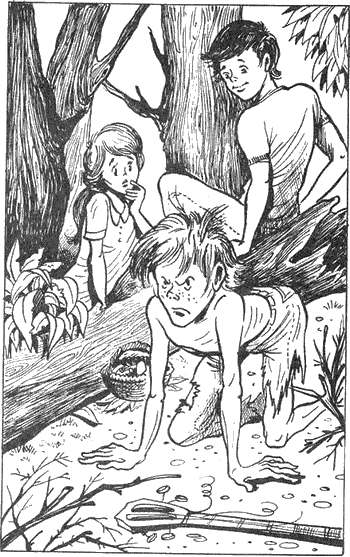Ранним утром Лидка сказала: — Ну, начинаем! — Сперва искупаемся, — хотел оттянуть зло дело Петька. — Я тебе не приказываю, — сказала Лидка, — но мы с Мишей одни построим дом и будем в нем жить. Тебя не пустим! Если бы эти слова сказал я, Петька стал бы артачиться, но Лидку он слушался беспрекословно. Он нарисовал круг и насчитал в нем тридцать шагов. — Значит, надо вырубить в лесу десять кольев, — сказал Петька. — Не будем мелочными, — возразил я. — Забьем по колу через каждые два шага. Легче переплетать ветками, а во-вторых, ты же видишь, как Митькины стенки шатаются. В общем, ты как специалист по копанию выроешь пятнадцать ямок. А мы пойдем рубить колья. — Опять мне самая тяжелая работа! — возмутился Петька. Всегда он считал доставшуюся ему работу самой тяжелой. — И я хочу рубить! Мне надоело все время с ним спорить. Я попросил: — Лида, скажи! — Петя, так надо! — сказала она. Петька покорно взял лопату, а мы пошли в лес. Срубали тонкие елочки и очищали стволики от сучьев. За три приема мы перенесли на поляну все колья. Тем временем Петька вырыл пятнадцать ямок, упарился и лег на траву отдыхать. Я вкопал колья в землю, но они шатались и вели себя подозрительно. Надеяться на их устойчивость было нельзя. Пораскинув мозгами, мы срубили пятнадцать жердей и приколотили их к верхним концам кольев. После этого наша конструкция стояла совершенно незыблемо. Зато прошел целый день, а руки и спины ныли, как после сдачи норм на значок БГТО. Едва хватило сил развести костер. Я спросил: — У Митьки спим или здесь? Как-никак, у нас три одеяла. — Крыша важнее, — сказал Петька. — От нее самое тепло. — А я за то, чтобы спать в своем доме, — сказала Лидка. — Предлагаю расчистить пол и натаскать травы, — поддержал я Лидку. — Обойдемся пока без крыши. — Предупреждаю, ребята: дом это последнее, к чему я прилагаю руки! — сказал Петька. — Докончим его — и станем жить в свое удовольствие, без всякой работы! С этим мы согласились. Кто же откажется жить в свое удовольствие? Поди сыщи такого дурака на свете… Целых два дня мы ничем другим не занимались, а только носили из лесу длинные ветки и заплетали их между кольями. На второй день Петька стал тереть поясницу и грозить, что наплюет на нас и уйдет жить к Митьке-папуасу. — Раз в жизни попал в страну, где все можно, а приходится с утра до ночи трудиться, вместо того чтобы развлекать себя легкими и приятными забавами, — стонал Петька. — Хочу, наконец, сесть посреди улицы и сыграть на гитаре «Во саду ли в огороде»! Но чувство еще удерживало его. Петька был влюблен в Лидку до неприличия. Он покорялся ей во всем. — Мы должны достроить дом и жить по-человечески, — повторяла Лидка. — Ведь мы не какие-нибудь жители… Плетень наконец соорудили. Но прежняя работа показалась нам детской забавой, когда начали месить глину и обмазывать стены. Тяжело вспоминать, какие мы были грязные, измотанные и злые. И Петька не выдержал: он швырнул лопату, плюнул и пошел разыскивать Митьку-папуаса. Когда мы, проработав день, легли без ужина спать, я услышал, что Лидка плачет. — Ты чего это? Она ревела и не отвечала. Мне стало жалко Лидку. Работала она наравне с нами — значит, уставала больше. Как-никак, она слабее нас, мальчишек. А тут Петька устроил предательство… Я подвинулся ближе к Лидке, погладил ее по голове и сказал: — Ну, не рыдай, Лидочка. Вернется твой Петька, н
