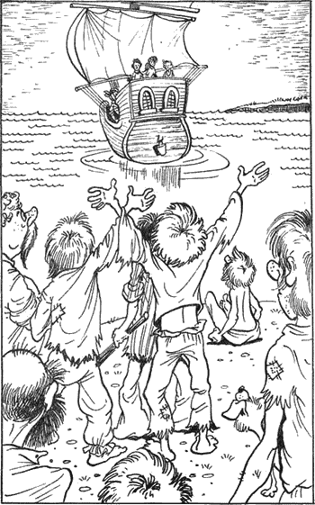 Так мы и не ходили собирать муравьев. Кормились мы то у королевы на кухне, то по старой привычке у Митьки-папуаса. Евтихий обеспечил нас луками и стрелами. В первую охоту мы убили двенадцать сорок. Даже Лидка одну подстрелила. Битую птицу Евтихий развешивал на ограде королевского двора. Чем больше сорок висело на ограде, тем лучше становилось настроение у короля Мура Семнадцатого. — Никакого неведомого царства не надо! — восклицал король, поднимая застреленную сороку. — Делал бы Евтихий достаточно стрел, да варила бы моя королева побольше компоту! Однажды Лидка упросила нас оставить оружие дома и пойти в лес за ягодами. Пройдя лес насквозь, мы вышли на берег моря в таком месте, где еще ни разу не были. В маленькой бухточке покачивался на волнах парусный кораблик. Паруса его были спущены и привязаны к мачте, черный якорь лежал на песке. Около него сидели на корточках капитан Прунамель и два жителя в трусиках. Они дулись в карты и заметили нас, когда мы подошли совсем близко. — Полундра! — сказал капитан. — Его величество со свитой, ту те ранги матуй! Король пожал ему руку и сказал: — Знаешь, любезный, я не считаю себя очень уж мудрым, но именно в эту минуту под мою золотую корону забрела ценная мысль. — Поздравляю, ваше величество! — торжественно произнес капитан Прунамель. — Вы мне расскажете, что это за мысль, или предпочтете сохранить ее в тайне? — Расскажу, любезный. Зачем же таить ценные мысли!.. Твой «Диоген» в порядке? — Всегда готов выйти в море! — доложил капитан Прунамель. — Тогда попроси матросов поставить паруса. Прокатимся на остров Высшей Мудрости, — сказал король Мур. — Давно я там не бывал. — Матросы! Карты бросить, якорь на палубу тащить, паруса ставить! — скомандовал капитан Прунамель басом. Матросы побежали исполнять приказание, а доктор сказал нам: — Поведаю! Король почти никого не возил на остров Высшей Мудрости. Я сам был там только раз, очень давно. В подтверждение этих слов король сказал Митьке-папуасу: — А ты не вострись, не вострись со своим ежиком. Тебя не возьму. Иди собирать поганки, любезный! Митьке пришлось пойти прочь. Матросы поставили паруса, отпихнулись от берега шестами, и «Диоген» поплыл к острову, который темным пятнышком виднелся на самом горизонте. Король сел на палубу, подставил солнцу печальное лицо и закрыл глаза. — Мало того, что в Мурлындии можно делать все, что хочешь, — говорил Петька восхищенным голосом. — Здесь еще преподносят сюрпризы в виде морской прогулки на парусном корабле! В какой еще стране возможно такое счастье?! Капитан, — сказал он нахально, — я хочу постоять за штурвалом! — Весьма сожалею, — ответил капитан Прунамель, — но штурвал у меня только один. Я сам хочу за ним стоять. Петькин номер не прошел. — Ладно, — сказал он. — В другой раз, когда вам расхочется. — Скажите, доктор, — спросил я, — а что это за остров такой? Почему «Высшей Мудрости»? Там жители мудрее, чем в Мурлындии? Доктор ответил с глубоким почтением: — Там не жители. Там проживают высшие мудрецы! Да такие мудрецы, каких и в древней Греции не водилось.