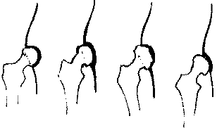Рис. 8. Дисплазия ведет к уплощению вертлужной впадины и недостаточному охвату ею головки бедра. Излишне подвижная головка при резком движении может вывихнуться из сустава частично или полностью