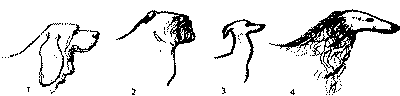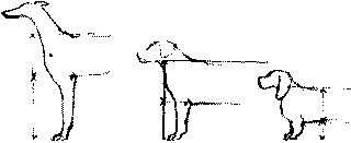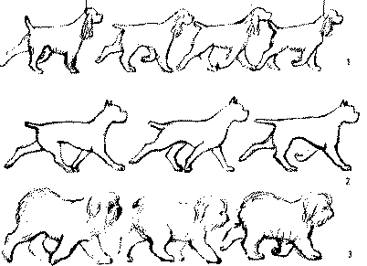 Рис. 167. Собакам рыхлого и сырого (2) сложения присущ живот, составляющий горизонтальное продолжение нижней линии груди, собак легкого или борзообразного (3) сложения отличает более резко подтянутый живот
