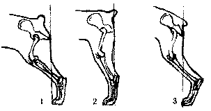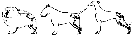 Если же при экспертизе собаки вы обнаружите высокозадость (в стойке или в движении), проверьте в стойке положение тазобедренного сустава относительно плечелопаточного и убедитесь, что он окажется выше уровня плечелопаточного. Это означает, что бедро коротко, отвесно поставлено и угол его наклона по отношению к седалищным костям меньше, а по отношению к подвздошным костям больше, чем 90 градусов. В норме угол наклона бедра отставленной ноги по отношению горизонтали колеблется между 95-120 градусами в зависимости от породы. При экспертизе надо быть внимательным к развитости бедер, они должны быть мускулистыми, широкими, объемными. Ширине бедер собаки всегда придавалось большое значение, а наши предшественники по кинологии для обозначения ширины бедра использовали специальный термин — «черные мяса». Мускулатура бедер легко развивается, если тазобедренные суставы устроены правильно. Если же бедра у собаки плоские, то это должно настораживать эксперта и настраивать его на особое внимание к строению и работе задних конечностей. Следующий сегмент задней конечности — голень, соединяя коленный сустав со скакательным, она оказывается как бы подвешенной между ними и играет роль шатуна, передавая двигательные толчки от плюсны бедру. Очевидно, что голень является самым уязвимым участком задней ноги: на ее поставе отражаются дефекты анатомии бедра и плюсны, погрешности строения коленного и скакательного суставов, да и собственная длина — избыточная или недостаточная. По длине и наклону голень должна соответствовать бедру, чтобы своей длиной и наклоном полностью обеспечивать амплитуду колебаний бедра. Длина голени считается правильной, если собака сохраняет правильным угол колена в стойке (при вертикальной плюсне отставленной задней конечности) и если колено не разгибается полностью при крайнем отведении задней конечности на рыси. Принято считать, что голень и бедро имеют примерно одинаковую длину, что повторяет ситуацию с плечевой костью и лопаткой. В конце этого раздела мы уточним это утверждение и покажем, что В НОРМЕ ГОЛЕНЬ должна быть НЕ КОРОЧЕ БЕДРА. Однако реальная практика показывает, что бедро имеет тенденцию к укорочению. Эта тенденция связана с отмечавшейся склонностью к укорочению плечевой кости и понятна с учетом принципа двух горизонталей, который устанавливает соответствие между плечевой костью и бедром, так что удлинение (укорочение) плечевой кости сопутствует удлинению (укорочению) бедра. Длина бедра является объектом особого внимания и по другой причине. Мы уже говорили, что сегодня в мире наблюдается тенденция к селекции на подчеркнутую высокопередость. Мы разбирали этот вопрос в разделе, посвященном холке, и показывали, что высокопередость напрямую связана с углами задних конечностей. Мы обращали внимание на феномен искусственной высокопередости, достигаемой ценой прямого плеча, и, что становится очевидным теперь, — также и утрированными углами задних конечностей. Если же углы задних конечностей увеличиваются не вследствие комплексного и адекватного удлинения бедер и голеней, а лишь за счет удлинения голеней, то эта селекция ведет к возникновению ряда дефектов:• к относительному укорочению бедер, выпрямлению угла коленных суставов, • к появлению высокозадости в движении, • к саблистости со все