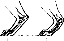 Тупой угол между этими прямыми говорит о тупом угле между лопаткой и подвздошными костями таза, т. е. о том, что кости таза занимают относительно горизонтальное положение (случай лопатки, наклоненной менее, чем на 45 градусов к горизонту, не рассматривается как выходящий за физиологические границы). Возникающая прямозадость естественно ведет к укорочению шага задних конечностей, т. е. к уменьшению их размаха. В этом случае собака толкается «в воздух», т. к. совокупной длины сегментов при открытии «скромных» углов задних конечностей не хватает, чтобы достичь на земле заветной границы (рис. 182).