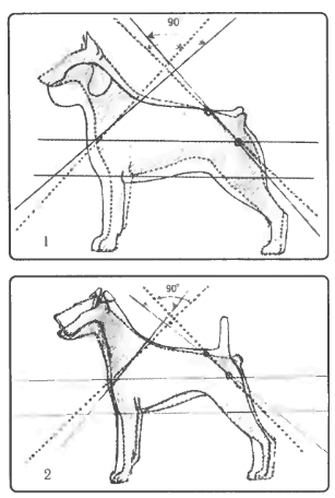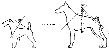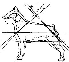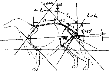 Рис. 182. Тупой угол между этими прямыми говорит о тупом угле между лопаткой и подвздошными костями таза. Возникающая прямозадость естественно ведет к укорочению шага задних, конечностей. В этом случае собака толкается «в воздух»