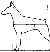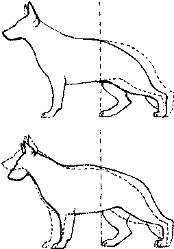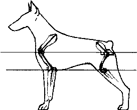 Рис. 171. В большинстве пород тазобедренные суставы должны быть в норме расположены на том же уровне, что и плечелопаточные. Другой частью этого феномена является исходная горизонтальная позиция отрезка, соединяющего локоть собаки с ее коленом