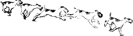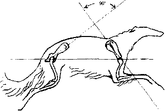 Рис. 185. Баланс в движении определяется балансом углов конечностей, соответствием длин шагов передних длинам шагов задних конечностей, соответствием между силой толчка задних конечностей и величиной вымаха передних конечностей