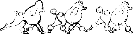 Возвращаясь еще раз к теме оценки размашистости движений, укажем дополнительно еще на один признак: у собаки с прямым углом плеча передние конечности на стадии противофазы образуют прямой угол. При этом также прямой угол будет образован и сходящимися под собакой односторонними конечностями. Баланс в движении определяется балансом углов конечностей, соответствием длин шагов передних длинам шагов задних конечностей, соответствием между силой толчка задних конечностей и величиной вымаха передних конечностей (рис. 185). Хорошо сбалансированная собака в движении вызывает впечатление схожее с тем, которое создают художники-мультипликаторы: легко и нарядно «работают» только конечности, а собака сохраняет свой рисунок незыблемым. Если все предыдущие критерии оценки движений собаки контролировались при осмотре собаки сбоку, то оценка параллельности перемещения ее конечностей производится при осмотре ее спереди и сзади (рис. 186). При движении от эксперта и на эксперта собака должна продемонстрировать параллельную «работу» конечностей. Это требование очевидно, т. к. оно обеспечивает поступательный характер собаки наилучшим образом. Мы уже касались типичных отклонений конечностей от продольной оси собаки во время движения в разделе о конечностях, поэтому повторять их не будем. Однако заметим, что иногда эти погрешности, будучи не выраженными в стойке, в движении проявляются. Так это и следует отмечать в описании. Следует также отчетливо понимать, что мера наказания за такие отклонения от параллельности конечностей в движении определяется в зависимости от пород по-разному. Так, для мастифа или сенбернара, либо другой тяжелой и относительно медленной собаки размет или косолапость, свободные локти или локти, направленные не строго вдоль туловища собаки, равно как и Коровина, козий постав, колени, вывернутые наружу или повернутые вовнутрь, являются не такими страшными дефектами, как для скоростных борзой, афгана, грейхаунда, уиппета, либо быстрых доберманов, шнауцеров, либо других подвижных пород. Однако и в породах, для которых скорость является важнейшей характеристикой, эти отклонения не следует преувеличивать, если они выражены достаточно слабо, т. к. большей частью погрешности постава конечностей, нарушающие их параллельность, относятся к издержкам выращивания. Гораздо ценнее правильные углы конечностей, которые относятся к весьма сложным объектам селекции. Осанка собаки в движении важна как проявление ее темперамента, как важная характеристика ее породного типа. Собаки, не обладающие достоинством, могут быть хорошо сложены, но они никогда не выигрывают, потому что лишены победительности. Движения породистых собак несут на себе отпечаток их характерной специфичности. Представим ряд: борзая, бульдог, фокстерьер, ньюфаундленд, афган, среднеазиатская овчарка, пекинес, папийон, ирландский волкодав, вельш корги, пудель. Каждая из этих собак имеет свою специфику в движении. Эта специфика также одна из важнейших характеристик породного типа и высоко оценивается, будучи ярко выраженной.