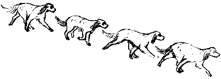 Закончив тему, посвященную конечностям, перейдем к движениям собаки. Движения собаки выявляют все ее взаимосвязи. Так хорошо сложенная собака будет выглядеть таковой и в движении. Если же у нее есть какие-то анатомические погрешности, то они будут проявлены в движении, даже если в стойке их удастся замаскировать. Нечасто приходится видеть собак, способных сохранять в движении тот же силуэт, который умелый хэндлер способен слепить в стойке. Еще реже встречаются собаки, которым движения только добавляют блеска, как бы высвечивая природные достоинства и делая их еще убедительнее, еще ярче. Таких собак, действительно, единицы, но именно они дают экспертам высокие образцы кровных животных, позволяют почувствовать и запомнить их особый кураж, переполняющую их радость от возможности с форсом выразить свое совершенство в движении. Движения собаки должны демонстрироваться естественно, без приспособлений типа «удавки» под горло, когда собаку «подвешивают» на высокий поводок, облегчая ей опору и усиливая ее высокопередость. Идеальным является случай, когда собака бежит, не натягивая поводка, показывая природный угол плеча вместо угла, искусственно созданного натяжением поводка, которое к тому же существенно улучшает линию верха собаки и углы ее задних конечностей. Тем не менее в ряде пород (терьеры, кокеры и т. д.) с традицией высокого поводка и «удавки» под горло приходится мириться. В ринге движения собаки осматривают на рыси и иногда на шагу. Движения рысью должны быть оценены в отношении свободы, легкости, толчка, размаха, баланса, параллельности, осанки, темперамента и специфичности. С помощью движений оценивается прочность конструкции собаки, а также ее выносливость. Свобода движений означает отсутствие закрепощенности, скованности, связанности и любого другого состояния, которое мешало бы собаке полноценно осуществлять перемещение указанными аллюрами. Легкость движений определяется минимумом усилий, которые собаке приходится тратить на совершение движений. Настоящая легкость узнается по ощущению, будто собака передвигается вовсе без усилий. Толчок задних конечностей оценивают по силе, которая придает движениям напор, и по тому, насколько активно разгибаются суставы задних конечностей. Размах конечностей определяется «вымахом» передних и «отмахом» задних конечностей. Полноценному размаху, как уже указывалось, соответствует прямой угол маятника, в который вписываются звенья односторонних, максимально раскрытых в противофазе находящихся конечностей. Кроме того, о длине шага передних конечностей собаки можно дополнительно судить по следующему условию: всякий раз выброшенная вперед передняя конечность в норме должна приземляться у основания отвесной линии, проведенной через глаз собаки. Это свойство, давно подмеченное экспертами на практике, находит простое объяснение. Толчки задних конечностей вынуждают собаку выносить компенсаторно вперед ее голову и шею, т. е. выносить вперед центр тяжести и тем самым терять равновесие. Очевидно, что собака выдвигает голову с шеей вперед тем дальше и теряет равновесие тем в большей степени, чем сильнее производятся толчки задних конечностей. Очевидно также, что стремясь вернуть равновесие, собака вынуждена выбрасывать передние конечности вперед настолько, чтобы те оказ
