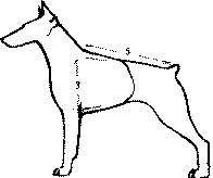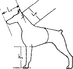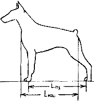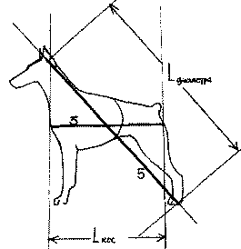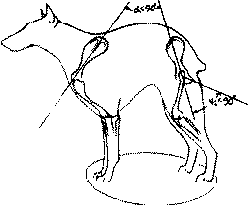 Рис. 183. Косая длина собаки равна расстоянию между лапами ее односторонних конечностей со стороны отставленной задней ноги при отвесной плюсне