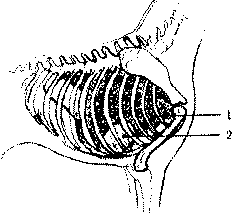 Рис. 163. Грудь собаки образована грудной клеткой, которая должна быть объемной, чтобы обеспечивать наилучшее развитие сердца (1), легких (2) и важнейших кровеносных сосудов