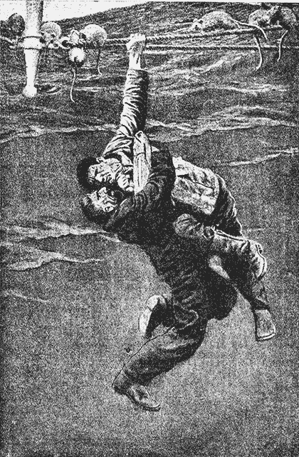 Тогда Жиртон сполз на шасси и втечение получаса всеми силами старался втянуть Розалию к себе на шасси, где она была бы в большей безопасности. Обессиленный, он прекратил попытки… Тогда летчик одного из спасательных аэропланов, Томсон, снизился над ареной, бросил вниз кусок картона и опят полетел вверх. Картон попал в руки одного из служащих цирка и тот прочитал: «Пришлите Фреда с веревкой; поднимем его; он может помочь поднять ее». Для непосвященных эти слова являлись загадкой и мало кто понял, что для спасения молодой девушки там, наверху, решили испробовать исключительный по смелости прием… Скоро Томсон опустился на землю и как только к нему влез их бывший товарищ Фред Лунд, ставший теперь коммерсантом, аэроплан взвился вверх и подлетел совсем близко к аппарату Пэнгбурна, под которым висела беспомощная фигура девушки. Взобравшись на верхнее крыло своего аэроплана, Лунд попытался схватить Розалию за ноги, надеясь, что их общая тяжесть сорвет парашют и таким образом они смогут спуститься на землю. Однако неровные подъемы и спуски аэропланов мешали этому и скоро стало ясно, что если девушке суждено спастись, то для этого нужно чудо — смелости и ловкости. Нужно нечто неслыханное и отчаянное. Томсон и Пэнгбурн переглянулись и поняли друг друга. Оба аппарата вдруг пошли рядом, так что крылья их почти соприкасались, и затем аппарат с Лундом немного опустился. Стоявшая внизу толпа замерла. Она следила за всеми движениями, затаив дыхание. Теперь все поняли, что должно произойти что-то необычайное. И вот, когда, казалось, что сейчас столкнутся и погибнут обе машины, Лунд, вытянув руки, делает скачек над бездной и хватается за перекладину на крыле аппарата Пэнгбурна. Момент… он скользит… пошатнулся… почти падает. Но вот раздался единодушный крик толпы… — Удалось! Ему удалось! Никто не знал, насколько близок был Лунд к смерти, когда поскользнулся, никто не знал, что он спасся только тем, что успел схватиться за перекладину. Один из зрителей уронил от волнения бинокль и, побледнев, воскликнул: — Это положительно чудо! Но дело спасения далеко еще не было закончено. Немного оправившись, Лунд добрался до сиденья, а оттуда до шасси, где отдохнувший Жиртон, снова тщетно силился втянуть Розалию на шасси. Они стали вдвоем тянуть ее, но снизу скоро стало видно, что у них не хватит сил, а когда Лунд полез обратно к сиденью, то внизу поднялся крик: — Им не удалось! Ничего не выходит! Между тем время шло. Летчики знали, что запас горючего в машине невелик; а раз он истощится, аппарат должен будет опуститься на землю и гибель девушки неизбежна. Но Пэнгбурн и Лунд не оставляли мысли о спасении. Они перекинулись несколькими словами, и Лунд взял на себя управление аппаратом, а Пэнгбурн, спустившись на шасси, присоединился к неутомимому Жиртону. Повиснув одной ногой и рукой на оси, он зацепил носком другой ноги пояс Розалии и она моментально схватила его ногу. На помощь ему пришел Жиртон, который проделал тот же маневр и, таким образом, они вдвоем подтянули девушку, пока не достали руками. Еще одно усилие — и они усадили ее на сравнительно безопасное место на оси между колесами шасси, т. е. на деревянном бруске шириною в три дюйма. «Сравнительно безопасным» это место можно было назвать потому, что между осью и основанием аппарата просвет был немного более трех фу