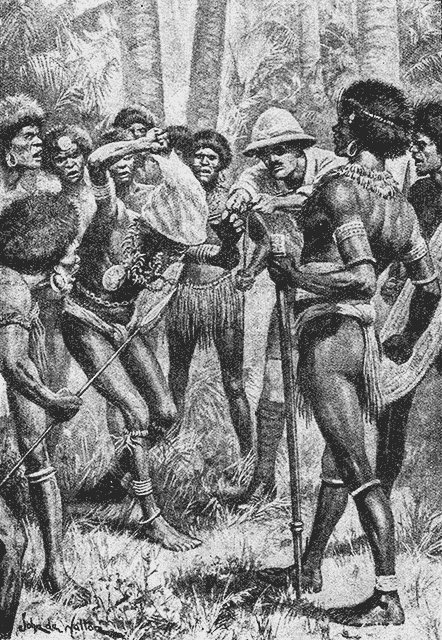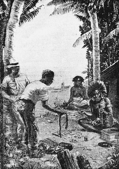 Соломоновы острова иногда называют «Воюющие Соломоны». Это прозвище дано очень удачно, так как нигде в южных морях нет таких воинственных и сварливых народов, как здесь. То воюет остров с островом, то одно племя с другим. Мне пришлось в первый раз попасть на эти острова, когда отвозили туда местных жителей, работавших на сахарных плантациях в Квинслэнде. У нас на борту было двести человек, которые представляли собою разношерстную толпу, одетую в яркие одежды и нагруженную ящиками с табаком, дешевым платьем, ожерельями из бус, цветной бумагой и разными мелочами, на которые они истратила свои годовые сбережения. Ввоз огнестрельного оружия на острова был властями безусловно воспрещен, а потому нам приходилось во время переезда несколько раз делать обыски, причем оружие оказывалось спрятанным во всевозможных местах. Так, в складках зонтика, выглядевшего самым невинным образом, оказывалось разобранное ружье; у женщин со странной походкой нашли ружья, привязанные к ноге. В Макамбо мы передали найденное оружие властям, а туземцев пересадили на маленькое судно, которое должно было развезти их по их деревням. Я в то время взялся нанимать рабочих на сахарные плантации. При удаче — это было выгодное занятие, так как за каждого рабочего, согласного прослужить два года, плантаторы платили около ста рублей. В моем распоряжении была шхуна с туземным экипажем, на которой могли помещаться сорок восемь рабочих, и мне удавалось несколько раз поставлять такие партии. Однако, это занятие было и очень рискованным. Не говоря уже о возможности кораблекрушения, в виду отсутствия хороших морских карт, бунта среди завербованных рабочих и столкновения с военной лодкой, всегда грозила опасность наткнуться на деревню, где был «долг головы». Это значило, что один из жителей деревни умер, находясь где-нибудь далеко, и его родственники и друзья находятся в поисках головы какого-нибудь чужеземца. Обычай — не из приятных! Они называют это «наведением порядка». Одно время в Малаите был «долг» двадцати голов, и тогда следовало держаться подальше от этих мест, пока не был «наведен порядок». Однажды в деревне Понга-Понга было сделано покушение на мою голову. Незадолго до моего приезда умер один из жителей, служивший на торговом судне, а потому требовалась голова предпочтительно белого человека. Я ничего этого не знал и, бросив якорь в заливе, спокойно вышел на берег. По установившейся практике, за моей лодкой следовала, как прикрытие, вторая, которая стала совсем близко от берега. Гребцы ее были хорошо вооружены и держали весла наготове на случай, если-бы мне пришлось спасаться бегством. Вышедшие жители встретили меня любезно и, как казалось, были настроены дружественно. На мой вопрос рассказали, что здесь много здоровых молодых людей, желающих работать на плантациях. Может быть я согласен пройти в деревню, чтобы там потолковать. Но я не согласился, так как не хотел далеко уходить от лодок, и сказал, что, по моему, здесь, на берегу, можно отлично решить все вопросы. Итак, мы стали, гуляя по берегу, обсуждать подробно вопросы о вознаграждении, о питании и вообще об условиях работы на плантациях. Все шло очень гладко, и я уже расчитывал навербовать большую группу рабочих. Вдруг с лодки раздался предостерегающий крик; оглянувшись я увидел спрятавшегося за стволом кокосов