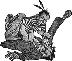 Я отнял у ребеночка нож и уговорил его снова лечь. Но с этого момента пропала последняя храбрость Билля. Он лег с нами, но ни на минуту не сомкнул глаз. Я, было, задремал, но на восходе солнца вспомнил, что Черный Предводитель собирался изжарить меня в этот час на костре. Я не был нервен и не боялся, но зажег трубку и сел, прислонившись к скале. — Почему ты так рано встаешь Сам? — спросил Билль. — Я? — ответил я. — О, это у меня просто заболело плечо. Я думал, что оно пройдет, если я сяду. — Ты лжешь, — сказал Билль. — Ты боишься. Ты должен был быть сожжен при восходе солнца, и ты боишься, что он это сделает. И он это сделал бы, если бы нашел спичку. Послушай, Сам, разве это не ужасно? Неужели ты еще думаешь, что кто нибудь заплатит деньги, чтобы получить обратно такого злобного человечка? — Совершенно уверен, — возразил я. Как раз таких сорванцов родители и боготворят. А теперь вставайте, ты и Предводитель, и варите завтрак, пока я поднимусь на гору для рекогносцировки. Я поднялся на вершину небольшой горы и окинул взглядом окрестности. В стороне Гипфельбурга я ожидал увидеть местных крестьян, вооруженных вилами и серпами. По моим соображениям, они должны были выйти на поиски дерзких похитителей ребенка. Но я увидал мирный ландшафт и среди него маленькую точку — одинокого человека, пахавшего землю на муле. Никто не обыскивал реку. Не было видно мчавшихся туда и сюда курьеров, извещавших отчаявшихся родителей, что нет никаких новостей. Этот кусочек поверхности Алабамы, лежавший перед моими глазами, был погружен в поэтическую дремоту. — Быть может, — сказал я себе, — еще не знают, что волки похитили этого нежного ягненка. Да поможет небо волкам! Я спустился вниз к завтраку. При входе в пещеру я увидел Билля, стоявшего прислонившись к стене. Мальчик грозил ему запустить в голову камнем величиной в пол-кокосового ореха. — Он засунул мне за ворот горячую картошку, — объяснил Билль — и раздавил ее потом ногой, а я бросил ему эту картошку в ухо. Есть у тебя какое нибудь оружие, Сам? Я отнял у мальчика камень и кое как умиротворил их. — Я тебе задам, — сказал ребеночек Биллю, — никто еще не бил Черного Предводителя. Берегись! После завтрака мальчик вынул из кармана кусок кожи, обернутый веревками, и вышел из пещеры. — Что это он надумал? — испуганно спросил меня Билль. — Может быть он убежит. Как по твоему, Сам? — Не беспокойся, — ответил я. — Не похоже на то, чтобы он любил сидеть у родителей под крылышком. Но мы должны выработать план, чтобы получить выкуп. Его исчезновение, кажется, не очень взволновало Гипфельбург и окрестности. Но, может быть, они еще не хватились его. Его родные могут думать, что он ночевал у тети Джен или у соседей. Но сегодня его во всяком случае хватятся. Мы должны сегодня же вечером послать извещение отцу с требованием двух тысяч долларов. В это время мы услышали воинственный крик, подобный разве тому, который издал Давид, поражая Голиафа. То, что Черный Предводитель вытащил из кармана, было пращой, и этой пращой он теперь размахивал вокруг головы.