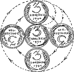 — Неправильно рассуждаешь. Обрати внимание на рисунок монеты. Когда монета Б придет в положение 2, рисунок окажется сдвинутым на пол оборота, в положении 3 — на один оборот, в положении 4 — на полтора оборота, а возвращаясь в положение 1 — на два оборота.