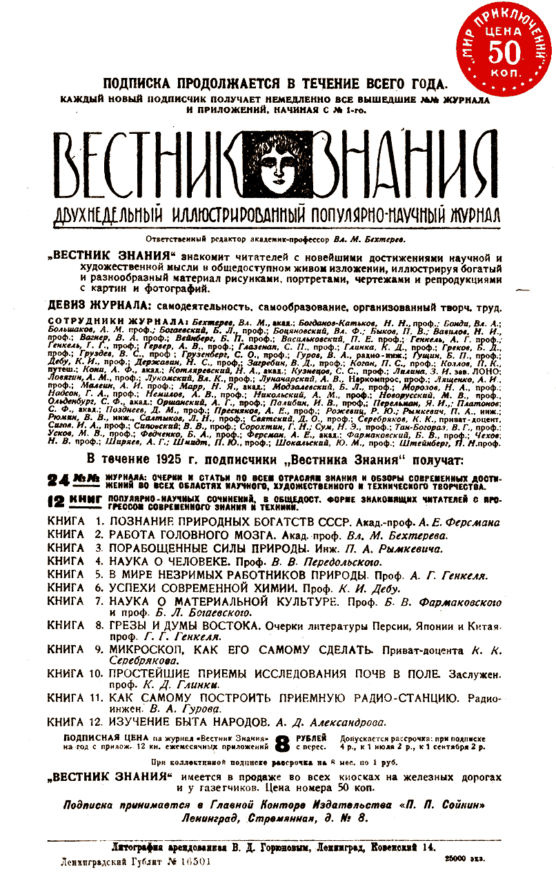 «МИР ПРИКЛЮЧЕНИЙ» за прежние годы распродан. Имеются сборники: №№ 1, 2 и 3 за 1924 г. №№ 1, 2, 3, 4, 5 и 6 за 1925 г. Цена каждого № 50 к., с перес. 70 к.