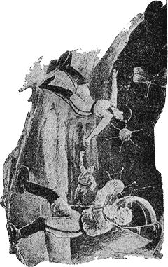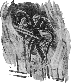 — Ого! — воскликнул он, потирая плечо. — Держу пари, что тут есть вольтаж! Я хотел бы воспользоваться этими животными растениями для своего безпроволочного апарата. Тут уж нечего бояться, что не хватит тока! Доктор Хэкенсоу был особенно заинтересован наблюдением над тем, как различные животные и растения воздействовали на отсутствие притяжения. Все предметы здесь не имели веса и малейшее движение животного могло поднять его на воздух, где оно бы и погибло, если бы не нашло способа вернуться на землю. Природа наделила некоторых крыльями, другим дала присасывающиеся ноги, похожие на мушиные, иные были прикреплены к земле корнями, в то время как другие были снабжены клейким веществом в роде птичьего клея, которое позволяло им двигаться, но не давало оторваться от земли. Но у некоторых существ не было никаких заметных способов прилипать к скалам. Они жили в норах и, видимо, трение их тела о нору спасало их от взлета на воздух. Это казалось ясным из того факта, что мертвые тела таких чудовищ плыли в воздухе, другие же, умирающие, очевидно, потеряв возможность удержаться в норе, поднимались на воздух и уж не могли вернуться назад. Пеп стало жалко этих несчастных созданий. — Я поймаю их и верну обратно в скалы, — воскликнула она и, не долго думая, впустила воздух в безвоздушное пространство своих сапог и изо всех сил сделала прыжок кверху. Опыт в аэроплане должен был бы научить ее осторожности. Здесь не было притяжения и результаты можно было, предвидеть. Сила прыжка Пеп швырнула ее высоко в воздух. Она несколько раз перекувырнулась в воздухе, с быстротой летя кверху. Пеп летела все выше и выше, а Миггс и доктор смотрели на нее во все глаза, широко открыв рты от удивления. Но некоторые из чудовищ заметили ее полет и одно их них, более смелое, чем другие, решило, что ее хорошо было бы съесть. Это было свирепое с виду существо с крокодильей пастью, рогом посреди головы, парой костлявых крыльев и чешуйчатой спиной. Сердце бедной Пеп замерло, когда она увидела летящее на нее чудовище. Доктор Хэкенсоу и Миггс безпомощно смотрели на это зрелище, потом доктор вдруг вспомнил, что у него в аэроплане есть несколько револьверов, заряженных атомной энергией. Он поднялся по лесенке в аэроплан и скоро появился, держа в каждой руке по револьверу. Это было оружие странного вида. Пули были такого устройства, что, ударяясь в какой-нибудь предмет, они освобождали запас атомной энергии, от которой с невероятной силой разрывался снаряд. Но доктор Хэкенсоу все же опоздал. Чудовище уже так близко подлетело к девушке, что доктор не решался стрелять. Но тут на сцену появилось новое действующее лицо. Среди странного вида существ этой удивительной страны, было одно с головой, слегка похожей на человеческую. Вместо рук, у него было четверо щупальцев. У него не было крыльев, но за то у него было два странных хвоста, забавно извивавшихся. Это существо, казалось, обладало разумом. Оно тоже видело, как Пеп летела по воздуху и глаза его следили за ней с жадностью. Но было ясно, что оно желало ее не в виде кушанья, а как подругу. Когда крылатый крокодил полетел навстречу Пеп, второе чудовище сейчас же, видимо, пришло к решению. Оно вскочило на спину существа, слегка напоминавшего стрекозу и, пользуясь двумя щупальцами для управления, отправилось в отчаянную погоню. У него не было крыльев