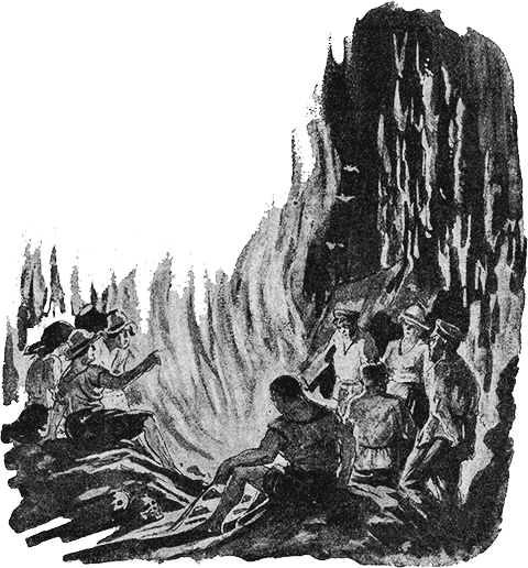 Так проходило время, час за часом, и каждый час приносил с собой увеличение в весе. И вдруг зазвенел электрический звонок. — Что такое! — закричал доктор, — на нашем пути должно быть какое-нибудь препятствие. Твои проделки, Пеп, отвлекли меня от внимательного наблюдения, которого требовала осторожность. Доктор пристально и озабоченно стал смотреть в колодец, но никакого препятствия не было видно. Тревожный же звонок все не умолкал. — Я ничего не понимаю! — воскликнул доктор. — Предостерегающий звон в камере поднялся бы только в том случае, если какое-нибудь препятствие на пути отражало бы обратно лучи нашего прожектора. Колодец кажется мне таким же открытым, как и до сих пор. Может быть, в камере произошло что-нибудь. Наша гимнастика могла встряхнуть провода, — Я на минуту закрою наш прожектор для проверки. Доктор выключил свет, но тревожный звон не прекращался. При осмотре камеры там не оказалось никакого короткого замыкания. — Не понимаю, в чем дело, — воскликнул доктор, — но я немножко уменьшу скорость. Нельзя допустить до несчастного случая здесь, на глубине тысячи девятисот миль под Землей. Нашим приятелям не легко было бы извлекать отсюда наши тела. Были приняты необходимые предосторожности и путешествие продолжалось уже с меньшей скоростью. Доктор на месте пилота внимательно смотрел вперед, с одной рукой наготове, чтобы выключить пропеллер, с другой же, чтобы сразу установить приспособления, похожие на лапы. Время шло, препятствий не было видно, тревожный же звон все усиливался. Совершенно смущенный, доктор Хэкенсоу взял из шкафа телескоп, долго и внимательно смотрел в него и вдруг закричал: — Впереди нас какой-то свет! Пеп и Миггс по очереди посмотрели в телескоп. Сомнений не было… Впереди, внизу колодца, виден был слабый, зеленоватый фосфоресцирующий свет. С их приближением, свет этот становился все сильнее и час спустя аэроплан вышел из колодца в огромную пещеру, освещенную каким-то рассеянным фосфоресцирующим светом.