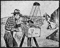 Дело в том, что радиоволны отражаются тяжелыми рудами, содержащими в себе металлы, вроде того, как зеркало отражает луч света. На этом свойстве радио-волн и построен прибор, изображенный на рисунке. Для применения этого нового способа нужно два таких аппарата. Один из них производит и посылает радио-волны при помощи особой антенны по одному определенному направлению. Другой прибор служит для улавливания этих волн. Оба аппарата устанавливаются по краям исследуемого участка, затем на него направляют радио-лучи и отмечают — от какого места радио-волны будут лучше всего отражаться. В этом месте тогда и начинают рыть пробный колодезь, уже уверенные найти там рудоносную залежь.